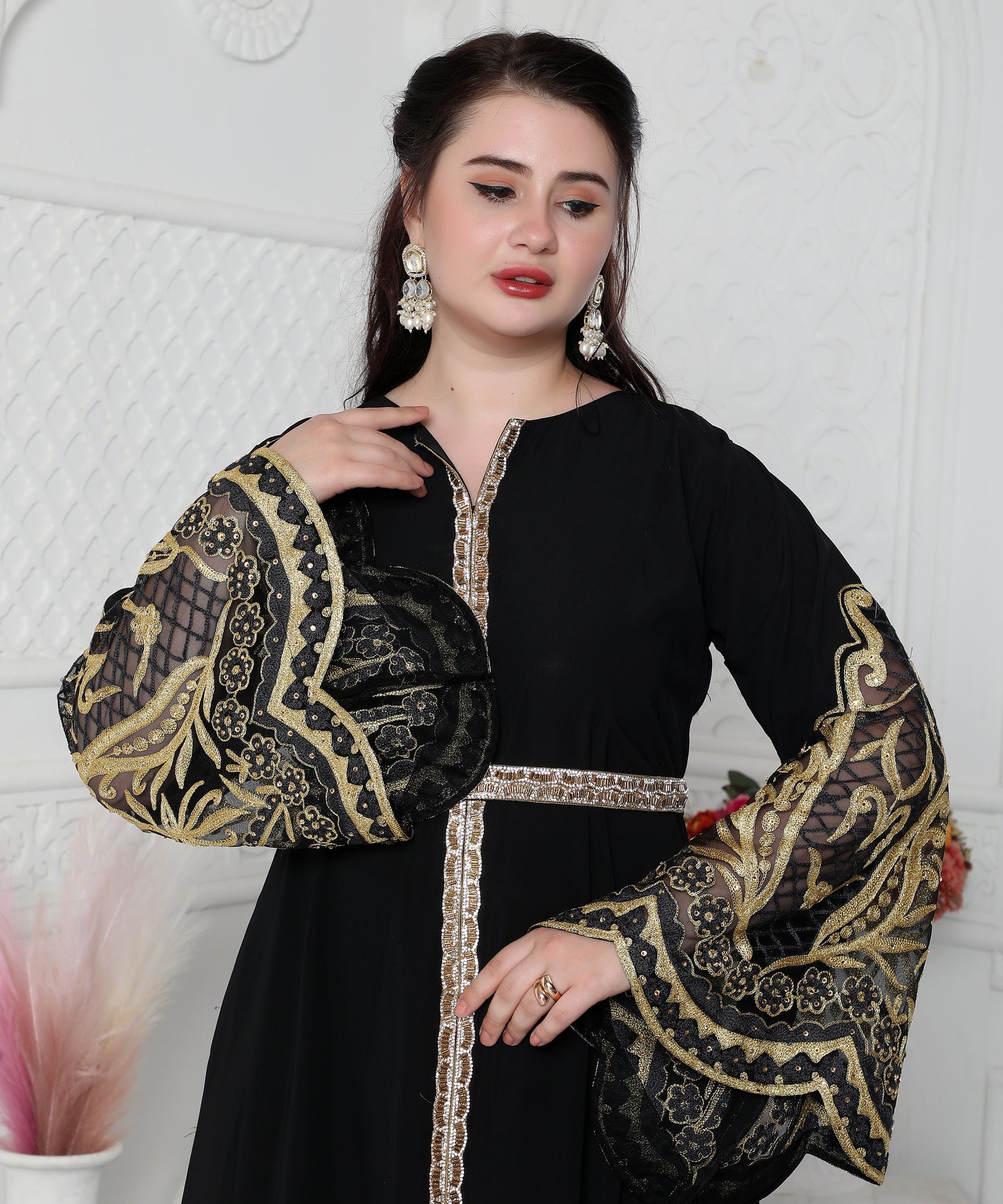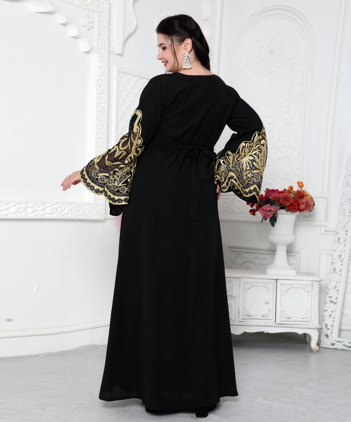 Big Flaired Sleeve Jalabiya With Golden Aari Embroidery |