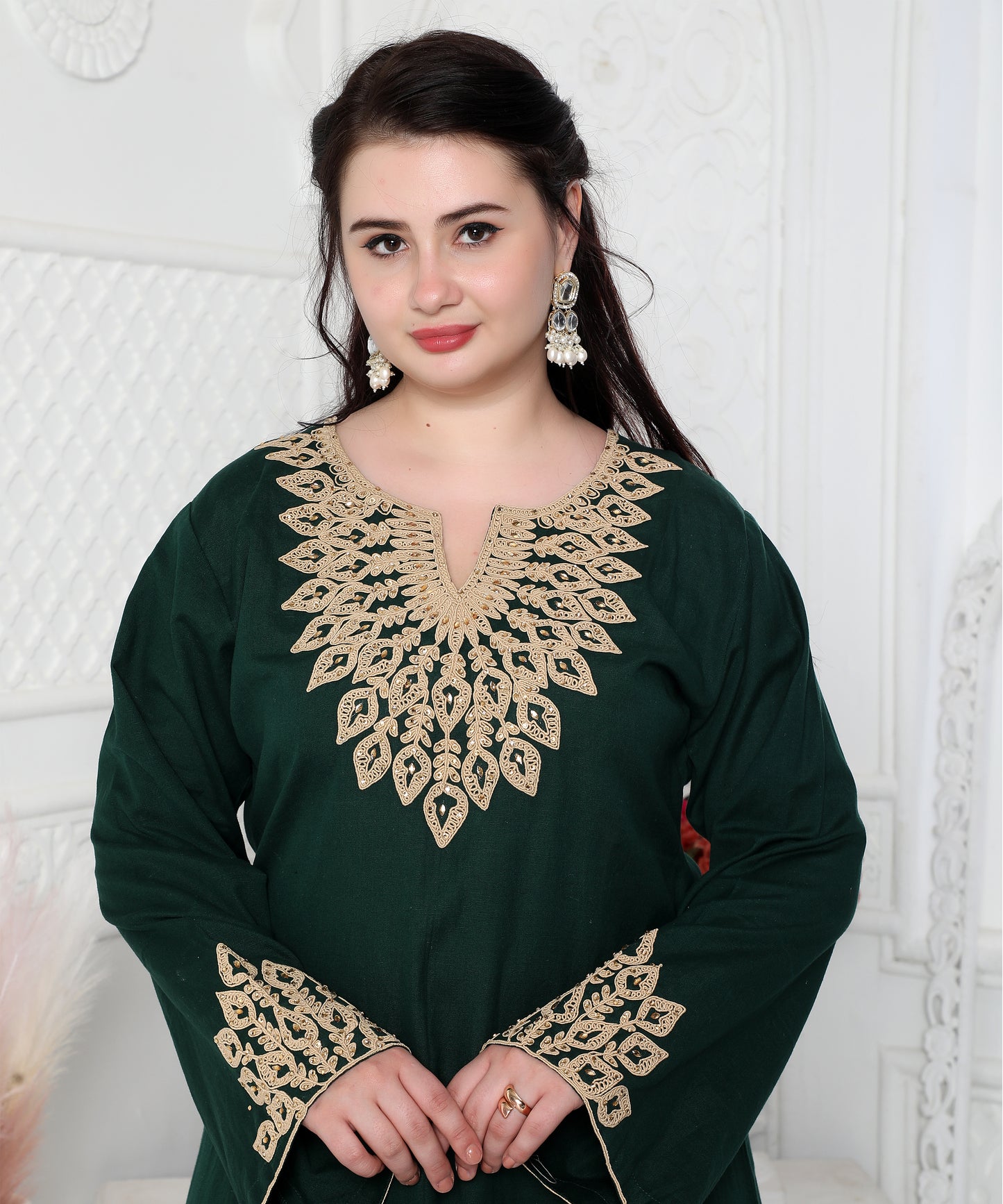 Gold Leaf Pattern Dori Embroidery Jalabiya In Dark Green |