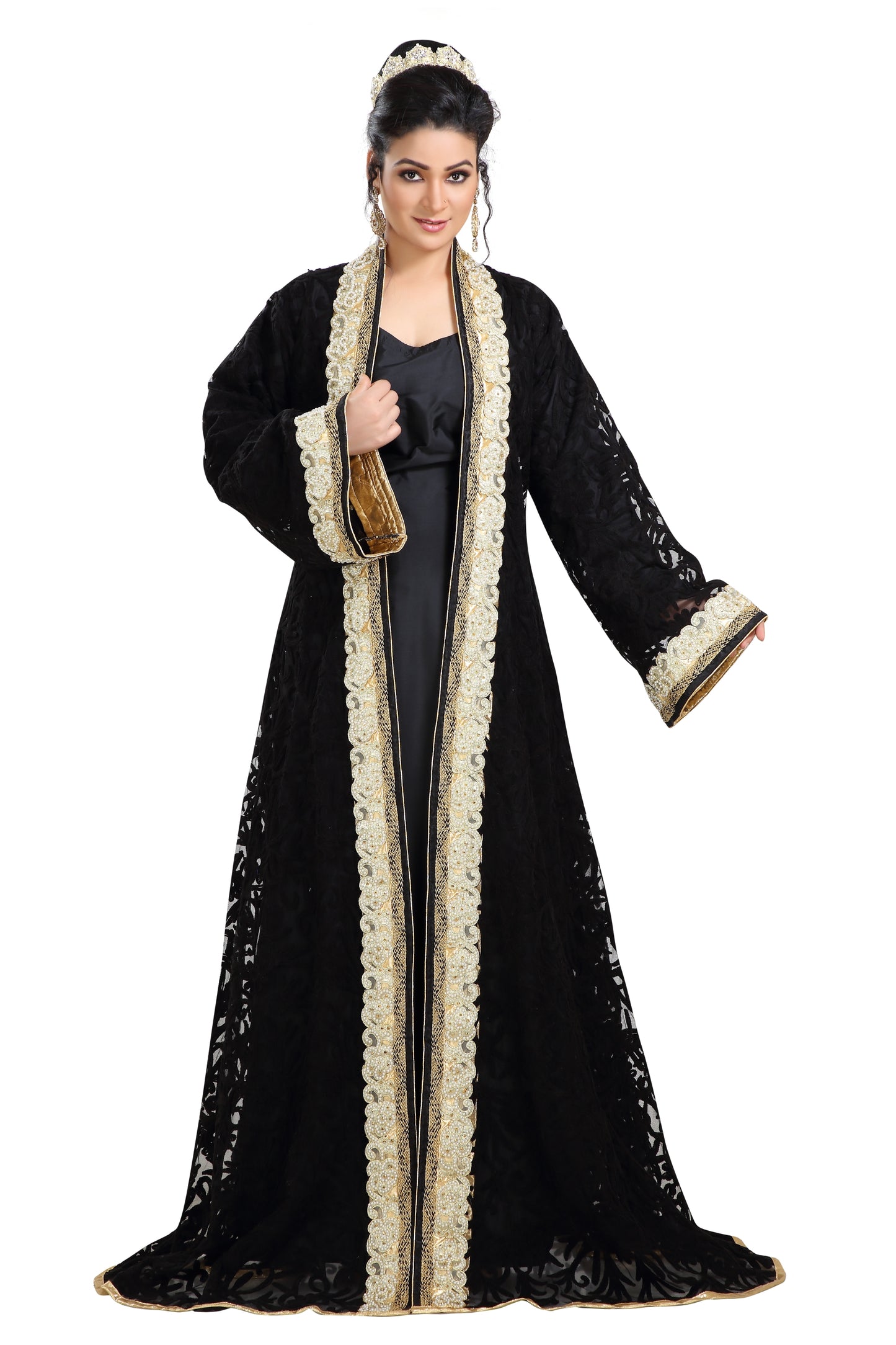 This mix colour beads and sequins hand embroidery with hand touch will glitter up your occasion. This black colour jacket -embroidered georgette & inner satin fabric kaftan dress is 3 piece set (with belt) & full sleeve dress (This dress is lined from the inside). Mix color sequins, beads, and hand stitching for a wedding or bridal occasions is classy and suits well into every wardrobe. The designs on this beautiful piece can brighten your occasion with grace and attraction. |