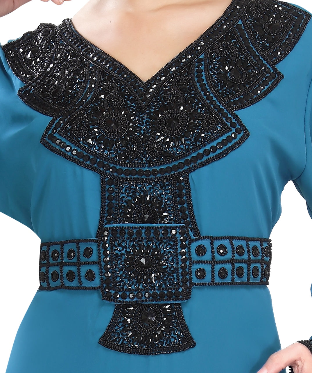Stylish, stunning and beautiful fabric kaftan beautified with black color sequins and beads that are hand embroidered, this gorgeous piece is designed by professional designers to represent the cultural heritage richness. This amazing high-quality georgette is full sleeves, displaying stunning hangings with volume, flares and finesse. With the awesome features of this 2 piece dress (with belt), your beauty will be enhanced thereby increasing your grace and charm during the occasion |
