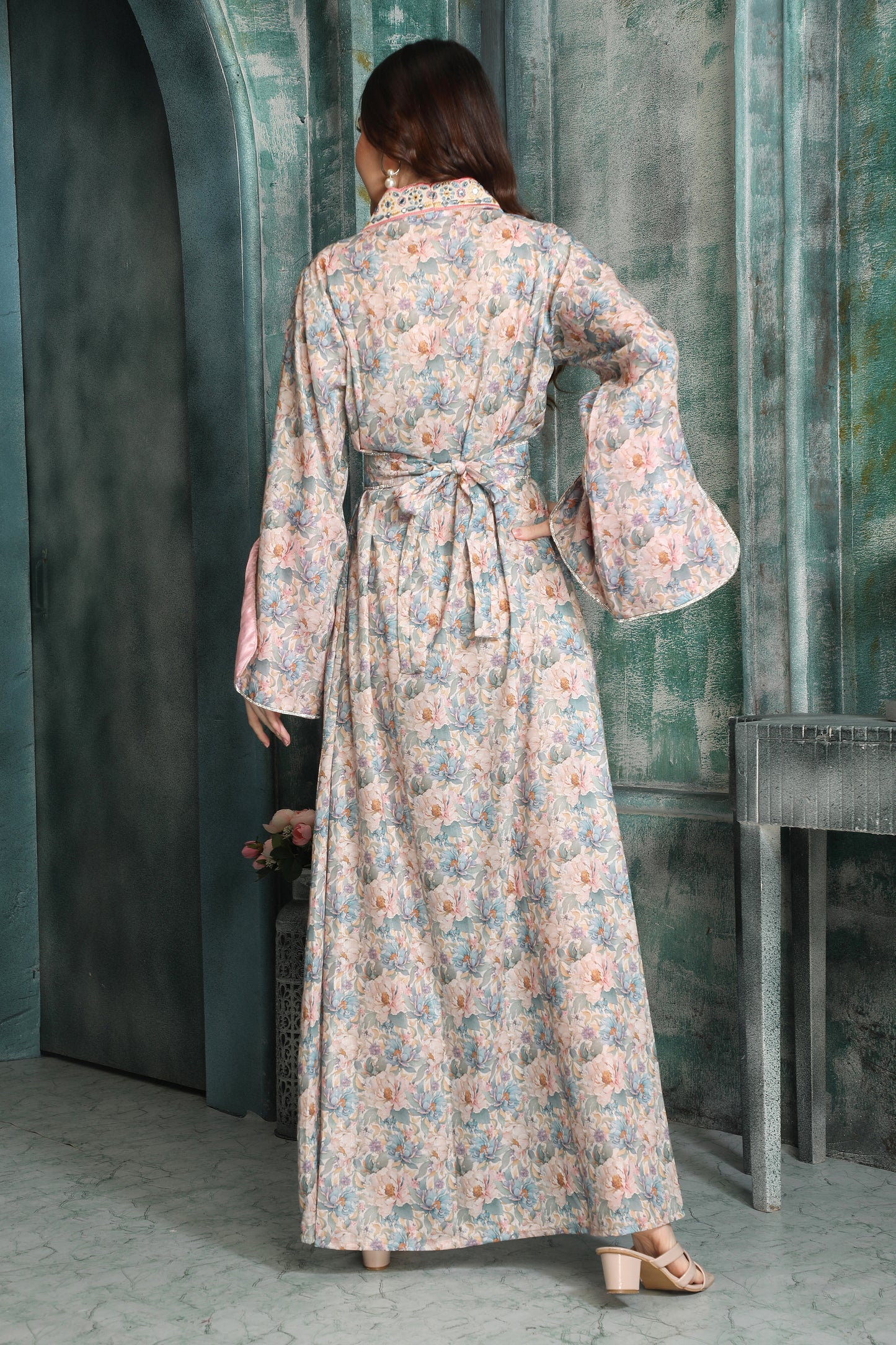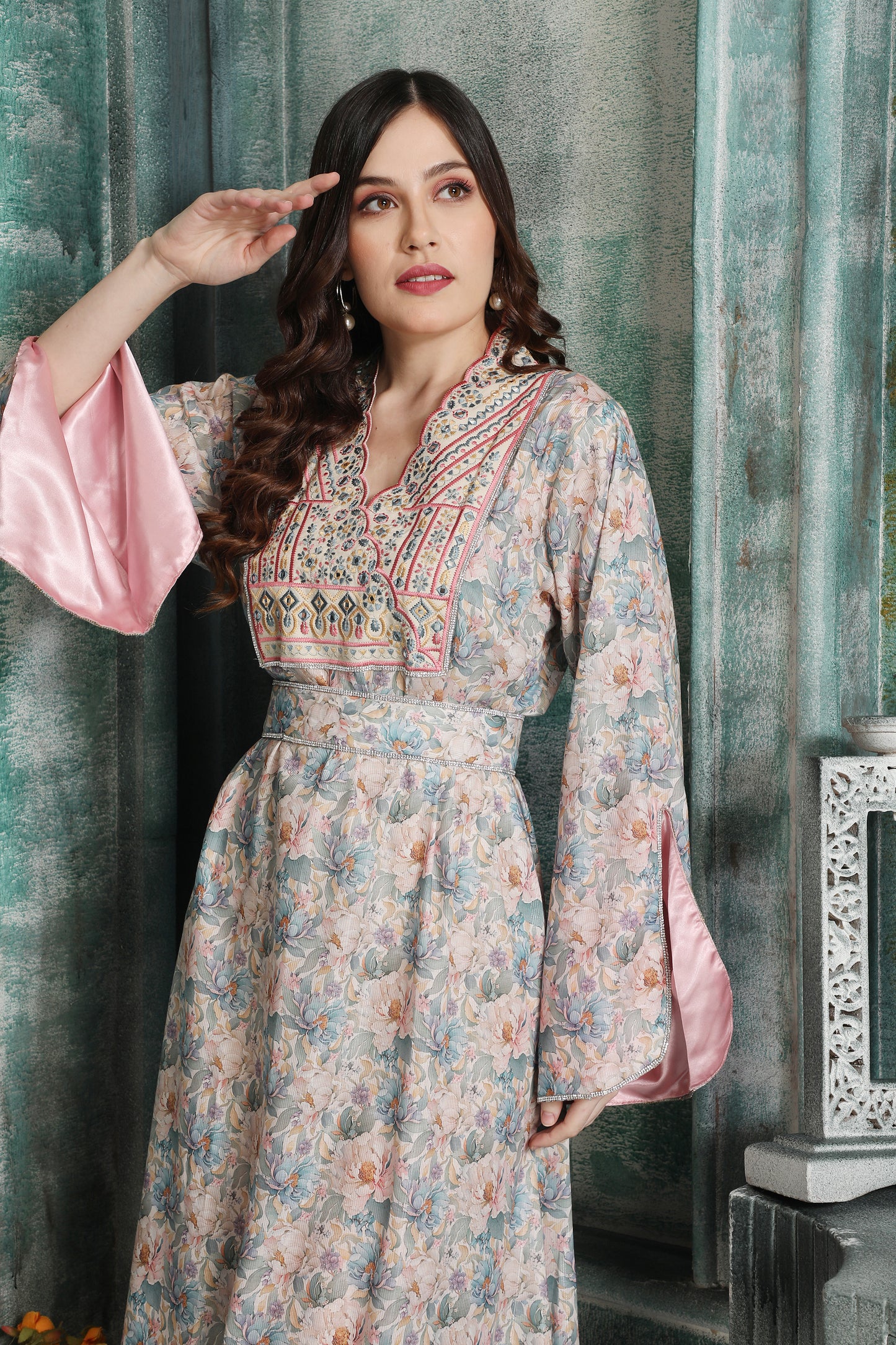 Floral Embroidered Modestwear Dress with Crystal Studded Lacework