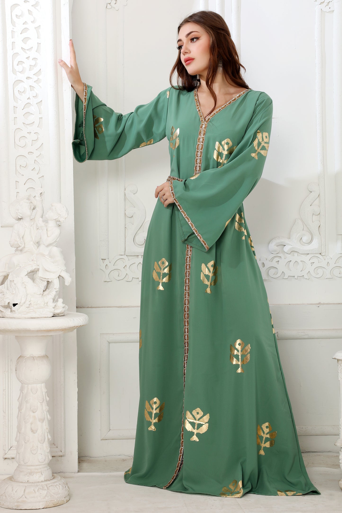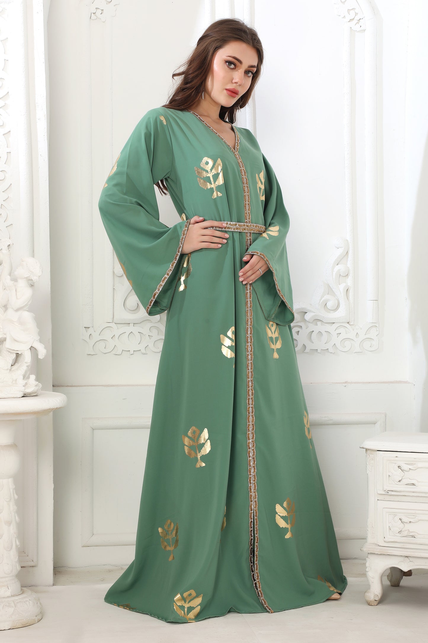 Moss Green Block Print Long Gown Kaftan