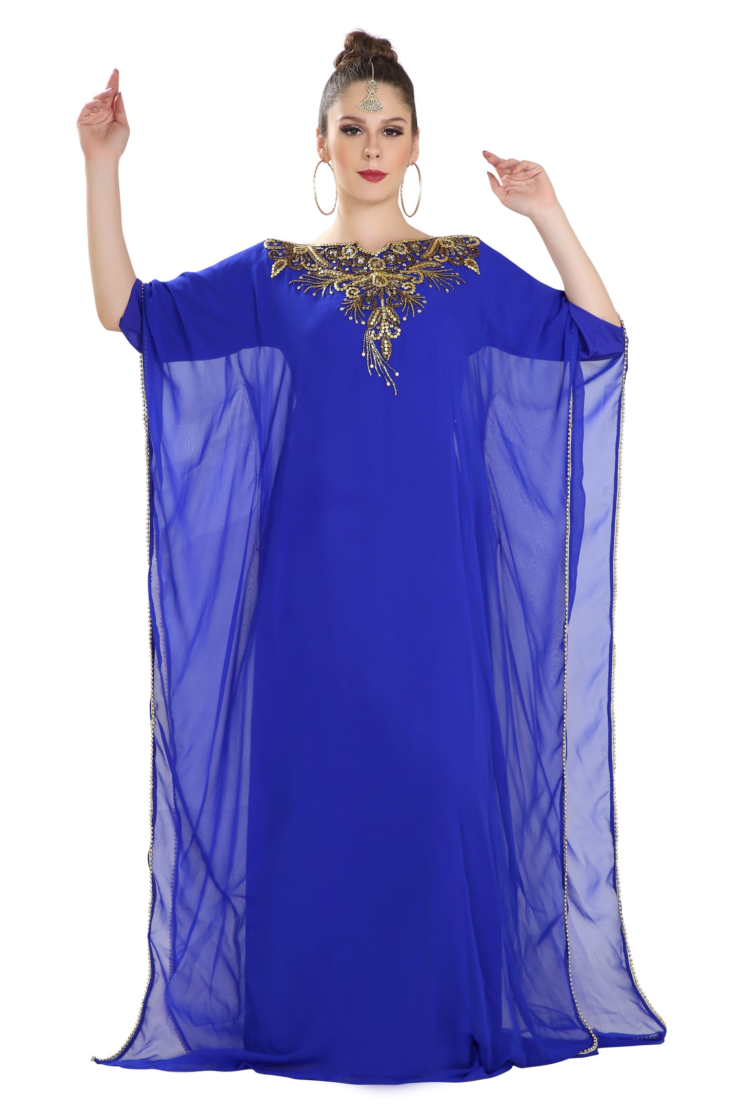 Fresh and sparkling! This long maxi gown will keep you fresh throughout your event. It is designed with a very cool and light weighted georgette fabric and also has a soft inner lining. This kaftan is hand embroidered with mix colour beads. Brought to you by maxim creation, this stunning piece is versatile and easy to wash and wear. This dress is 1 piece set & half sleeve dress. |