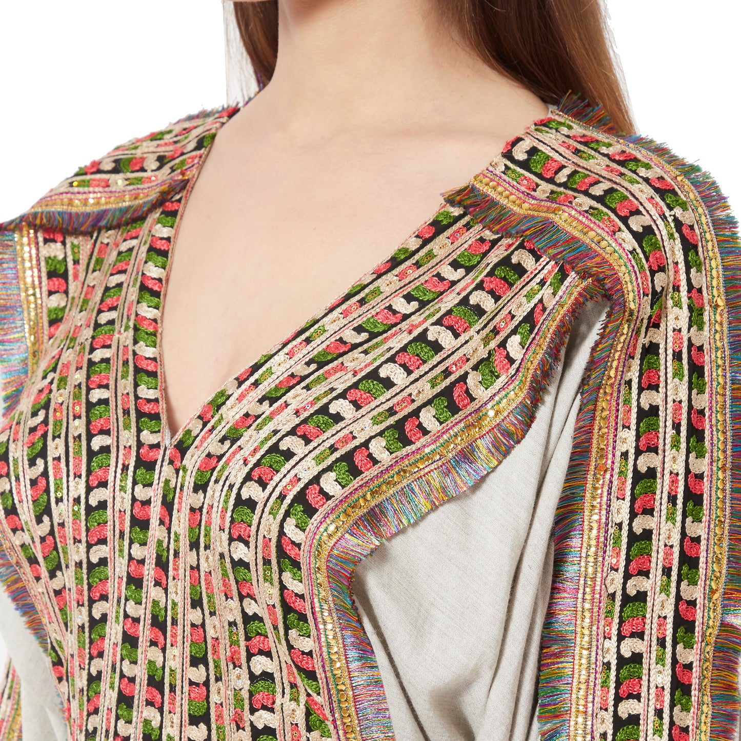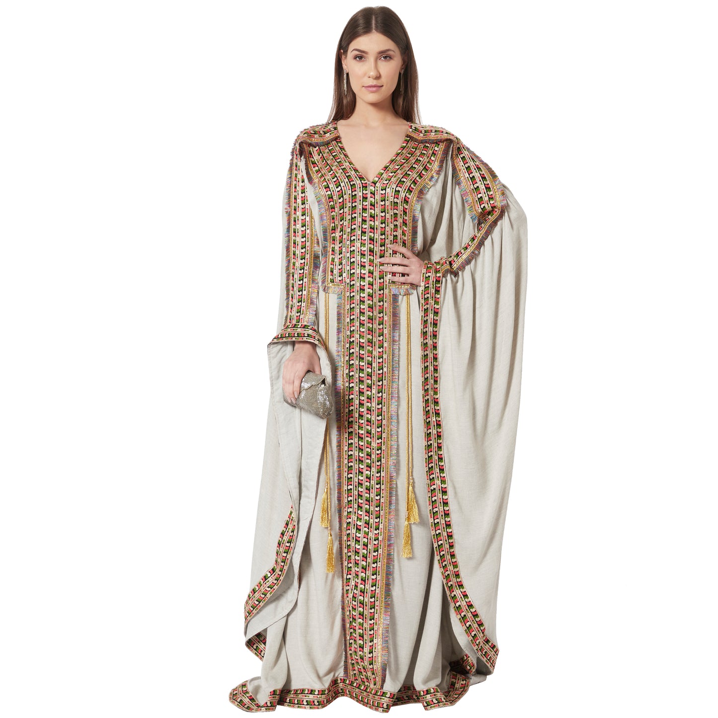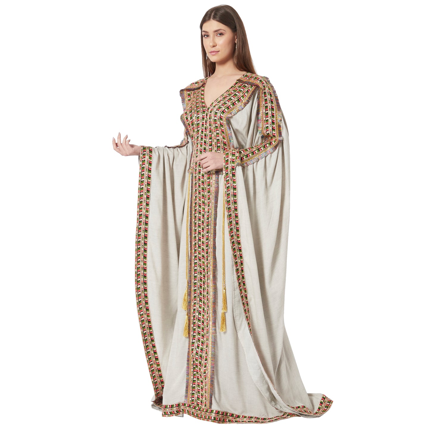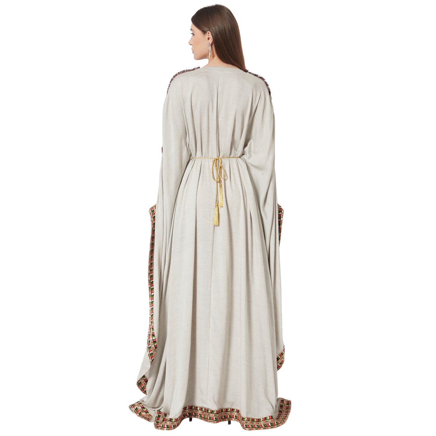 Grey Kaftan in Long Sleeve Tea Party Farasha Poncho in Thread Work