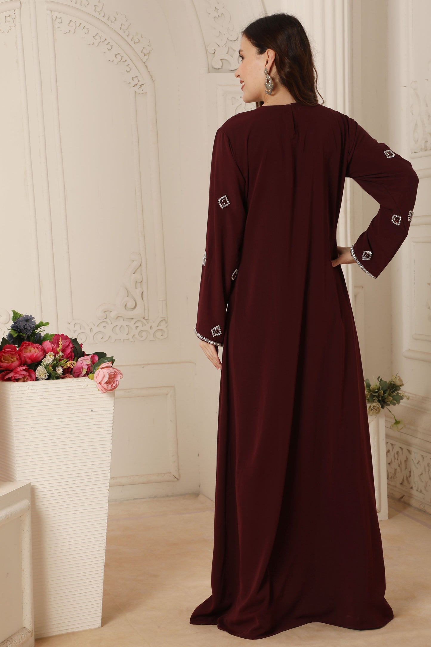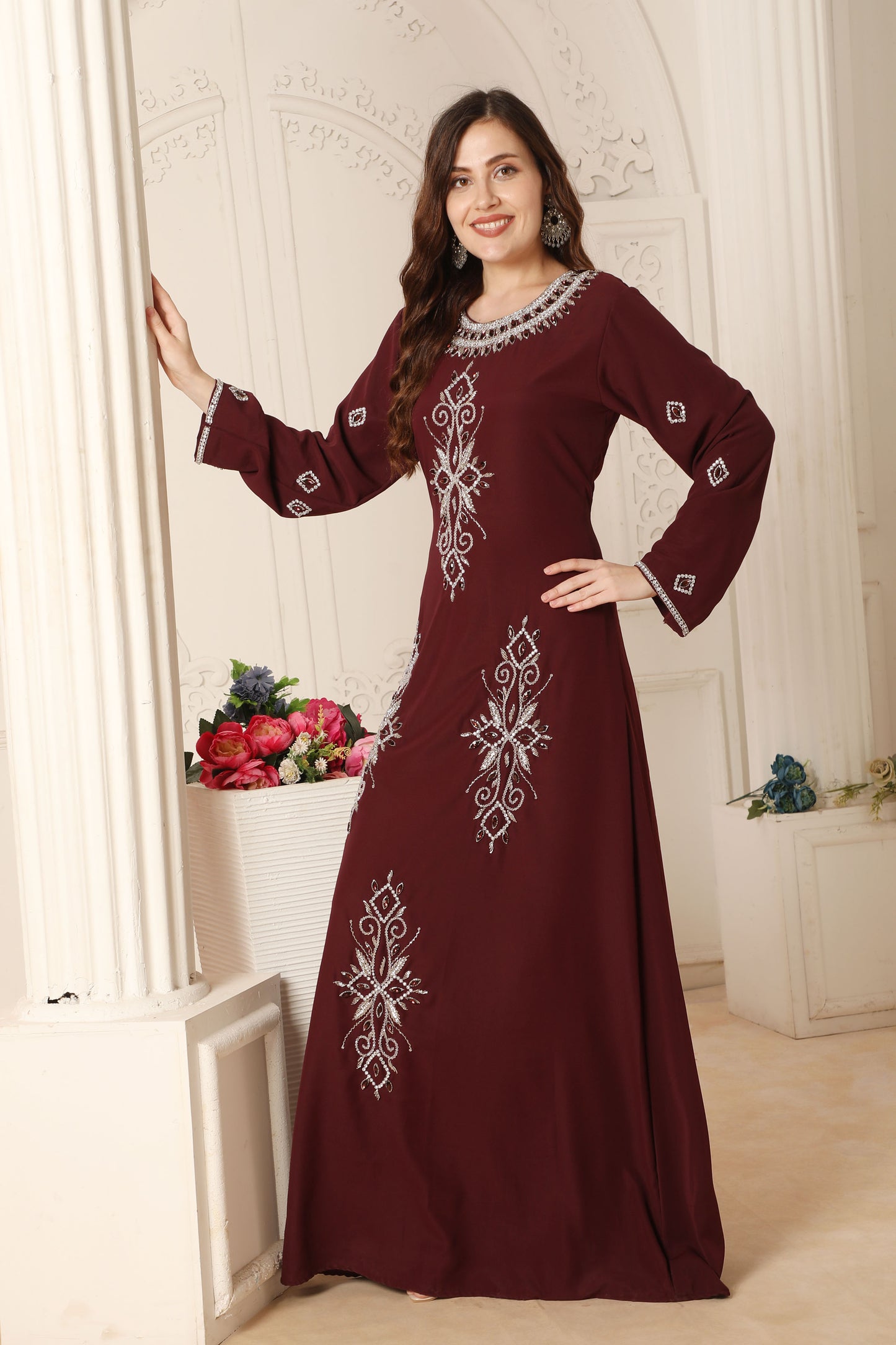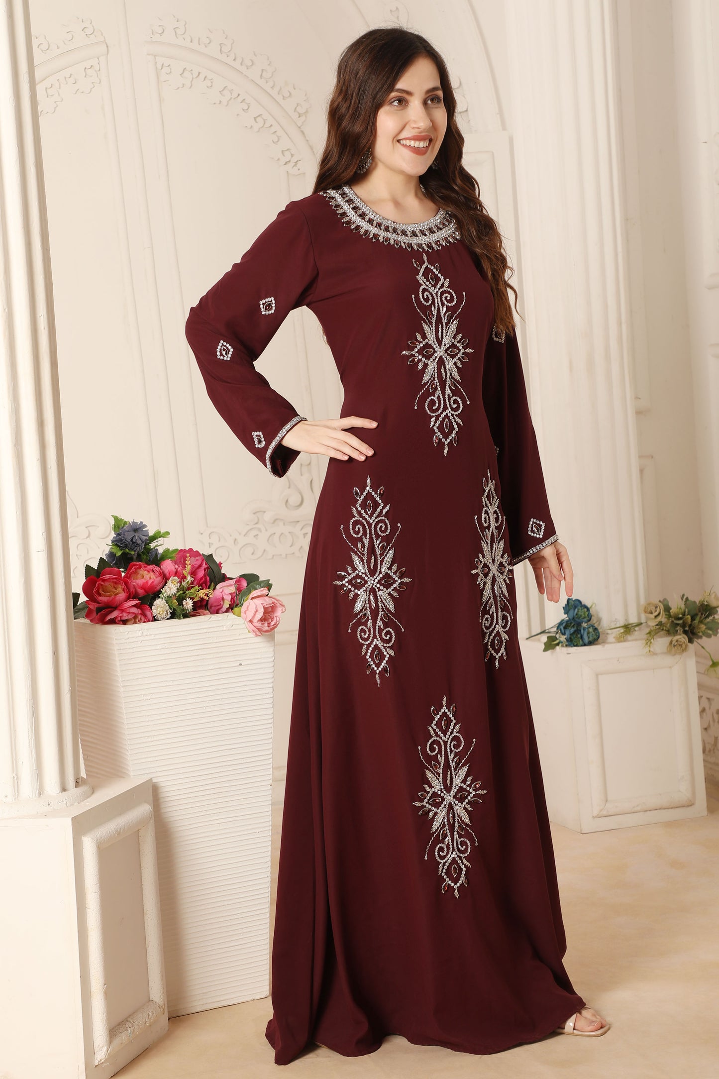 Maroon Hand-Embroidery Kaftan Gown in A-line Cut |