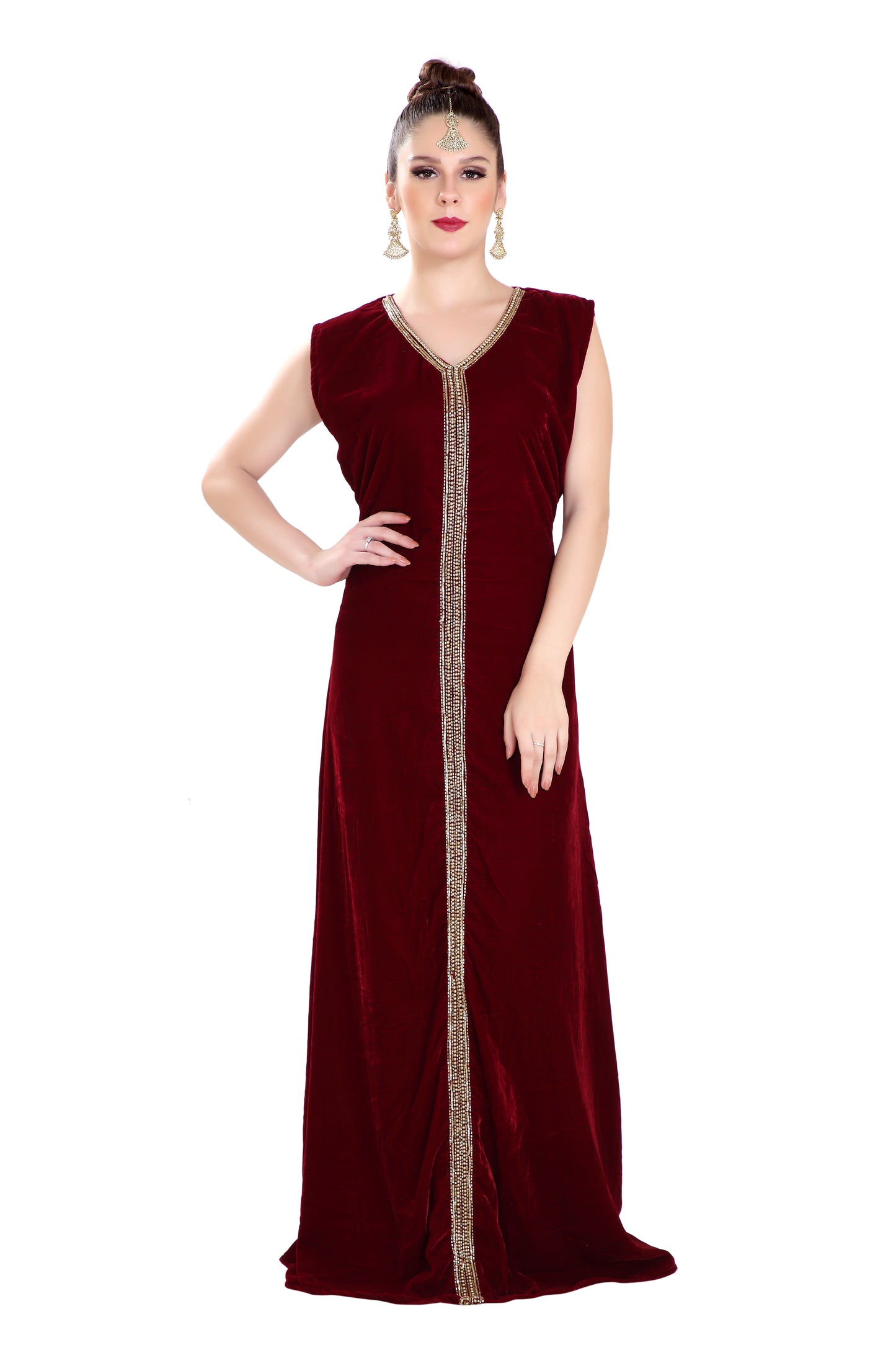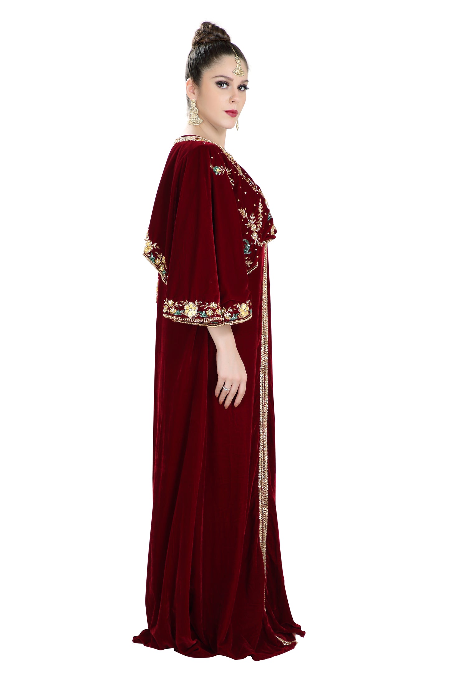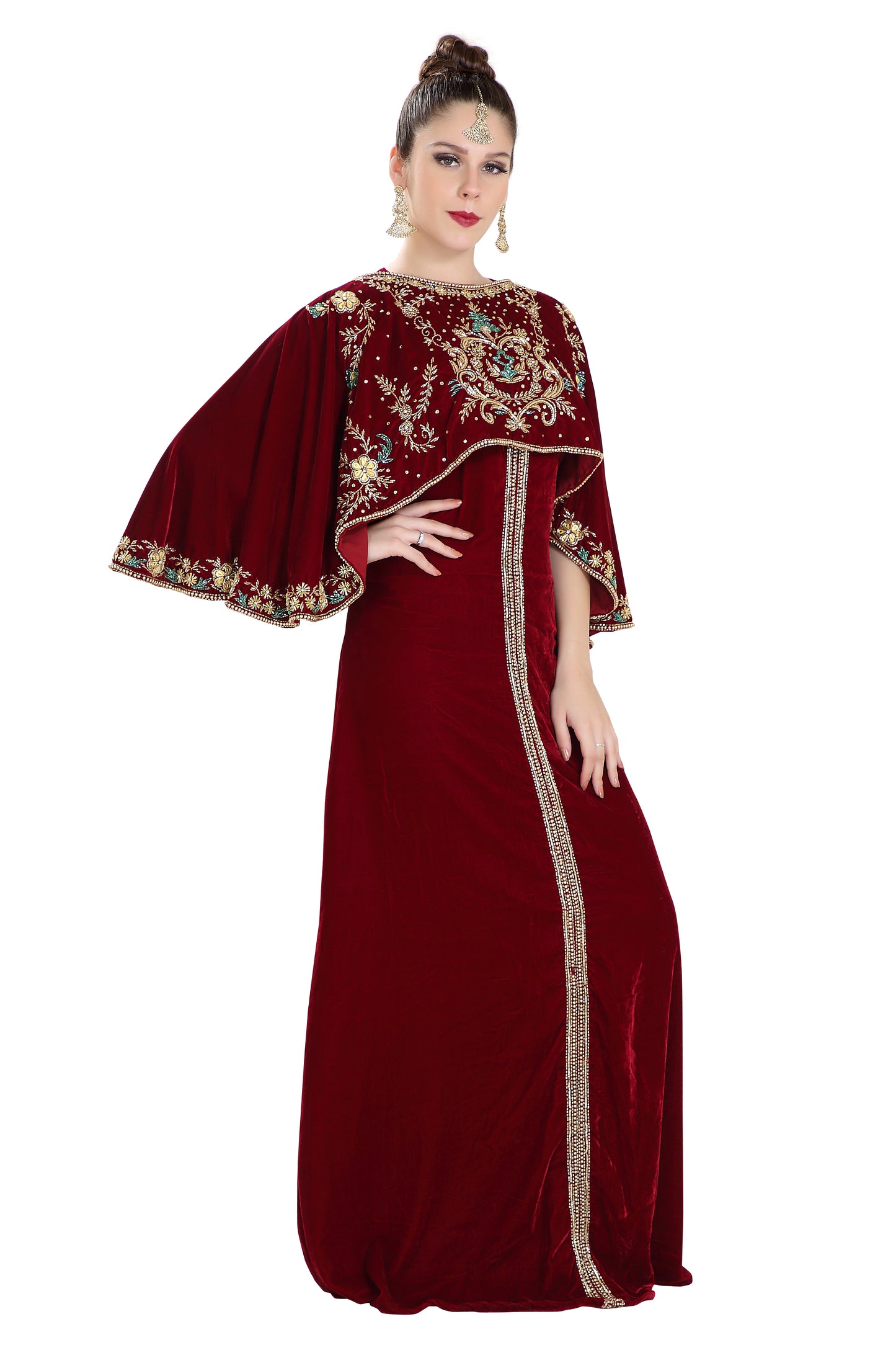 Filch the hearts away using this maroon embroidered velvet fabric bridal gown. This timeless and luxurious 2 piece kaftan dress is perfect for eid or any function or wedding occasion capturing the heart and attention. The dress is finished with a beaded sash to give an extra touch of elegance. Use the top cardigan separately and mix and match your dress with this multipurpose velvet top. |