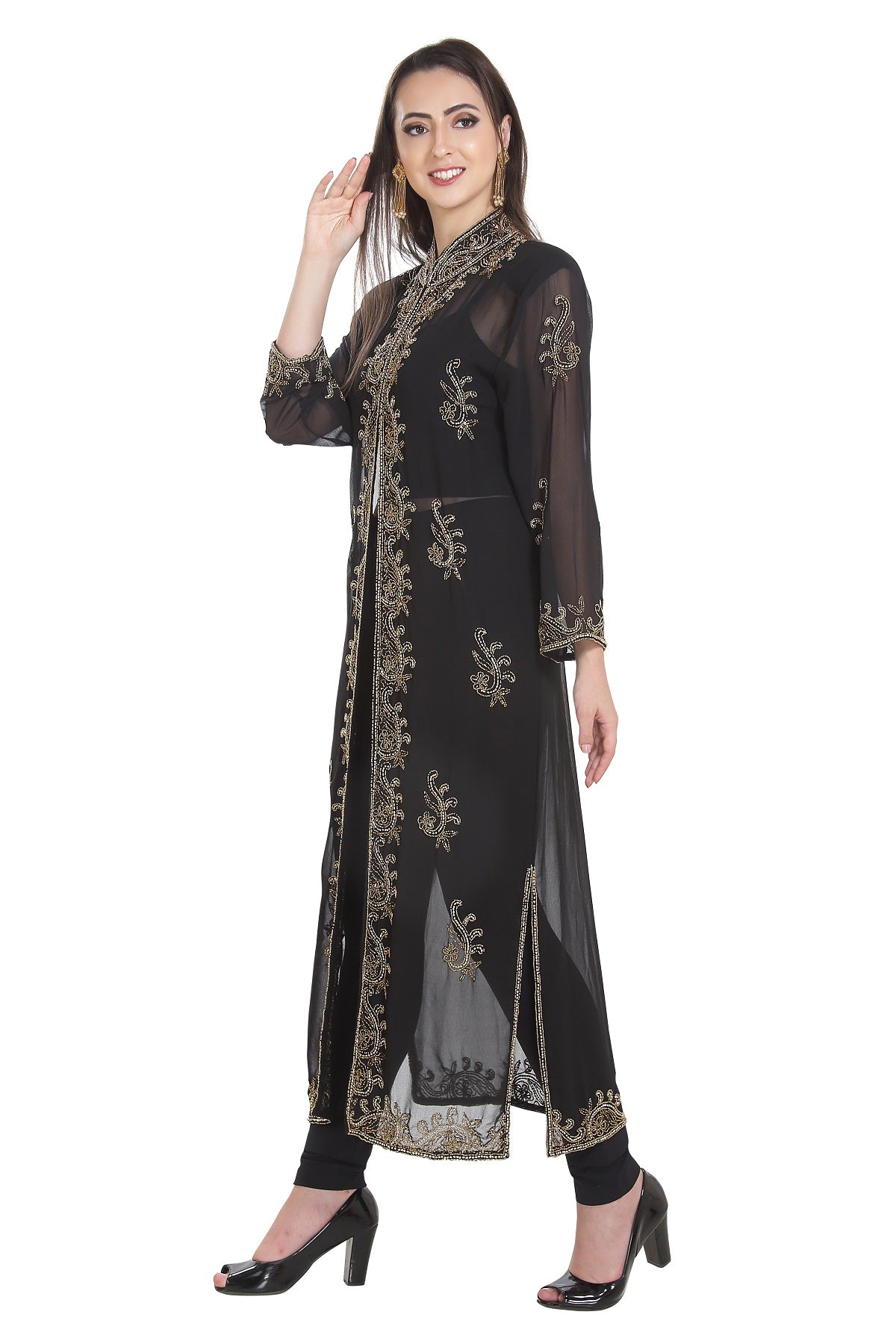 Long overcoat jacket, brought to you by Maxim Creation, has interior lining, hand embroidery and long length and can be paired up with any jeans you like. You’ll have a cozy fit. Simplify your shape with this 1 piece set and long sleeve drape. Flatter every curve with this golden color sequins and beads handmade cardigan. Team up this lightweight attire with any leggings or jeans to look drop dead trending. this georgette fabric kurti dress is 1 piece set (top only) & full sleeve dress (this dress does not have lining from the inside). |