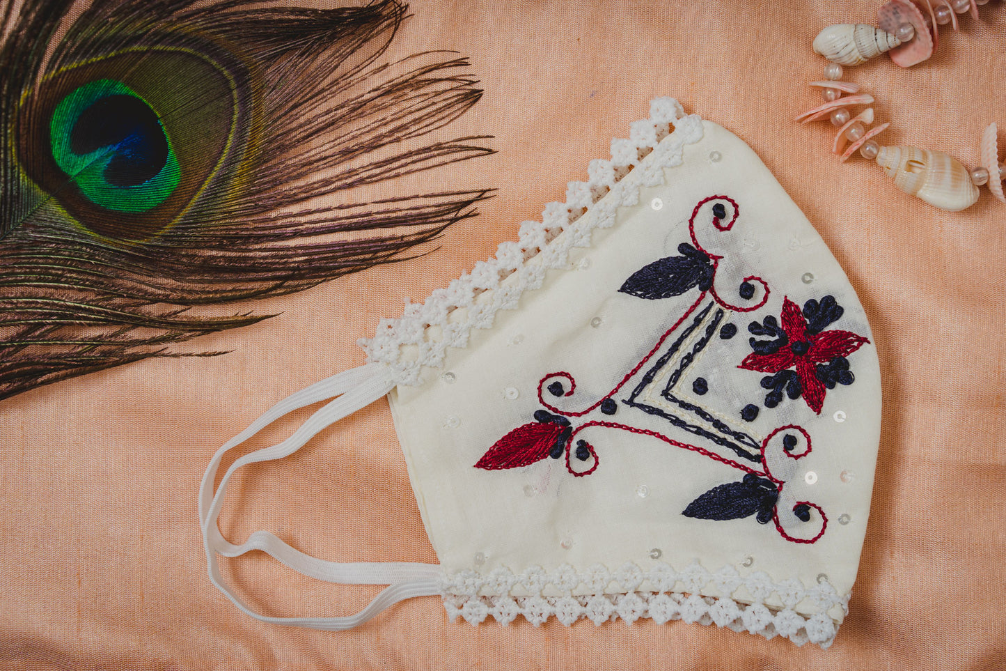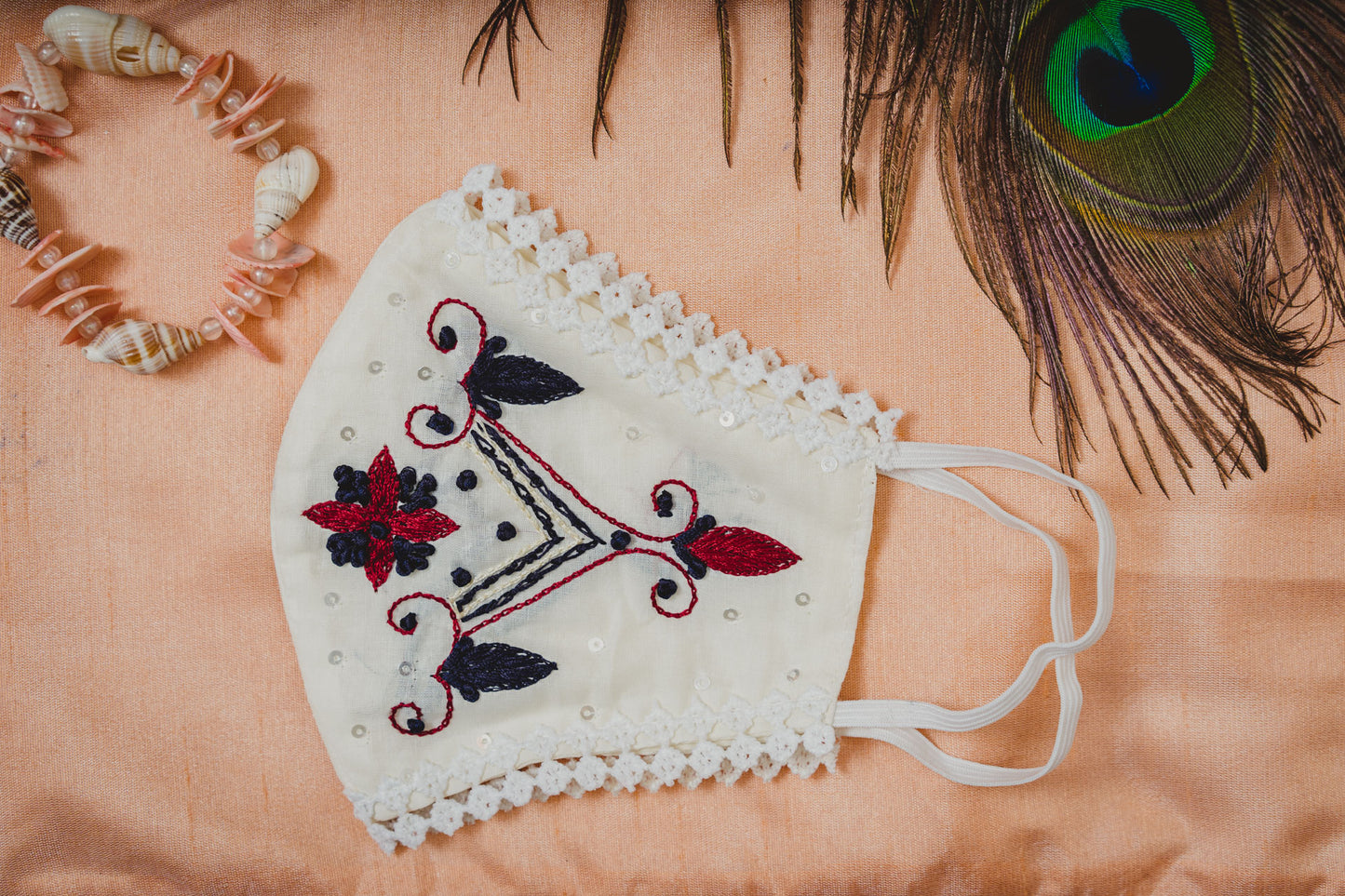 Cream Cotton Face Mask with Floral Embroidery |