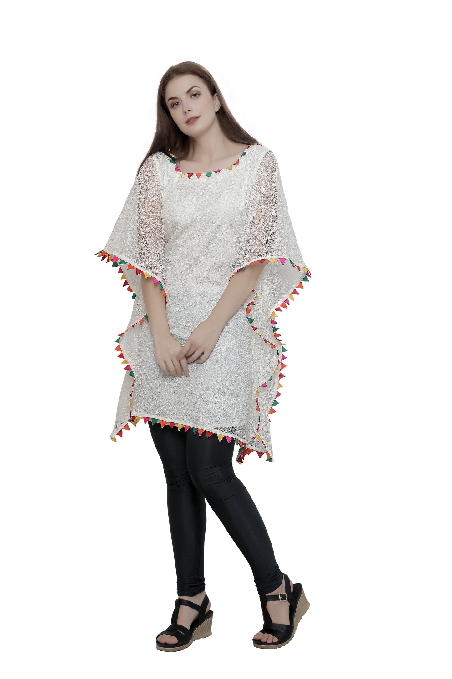 Cream Floral Net Beach Caftan with Colorful Trim |