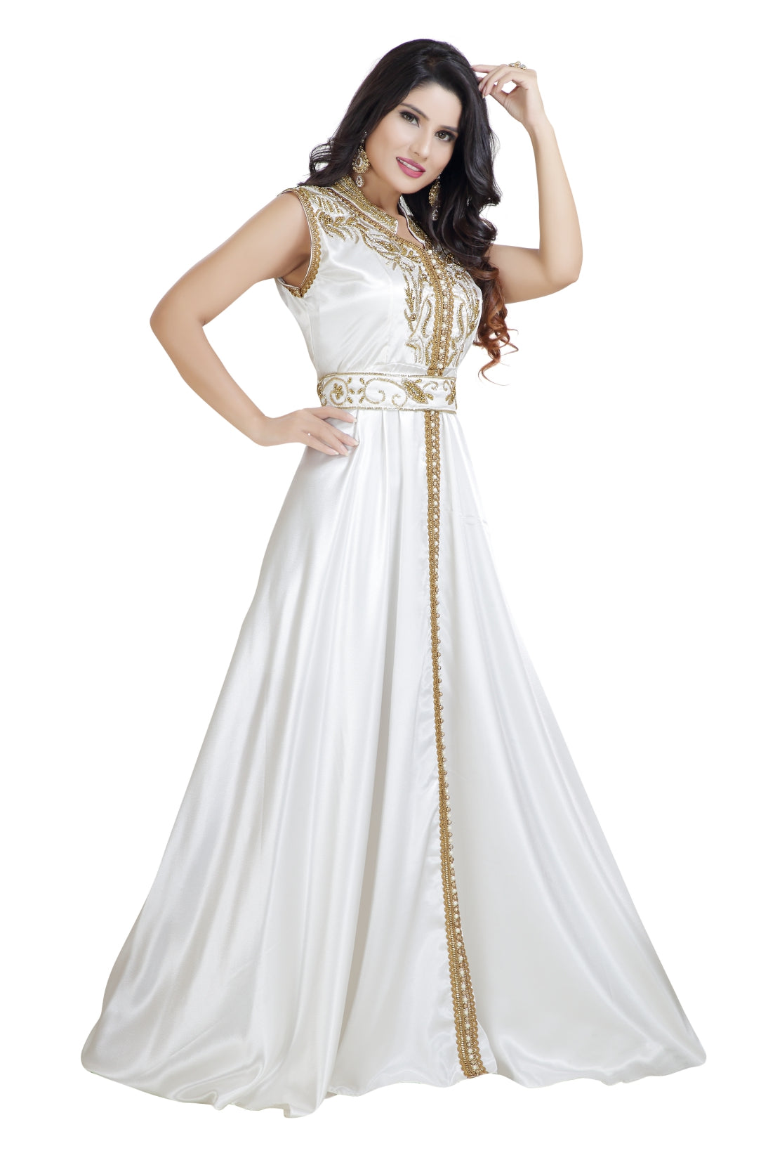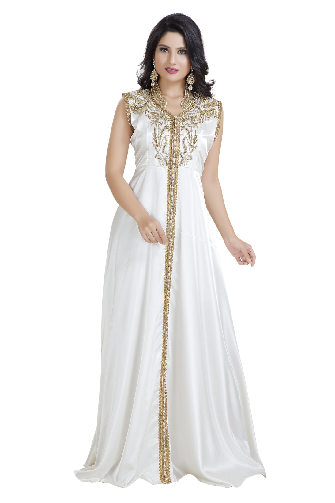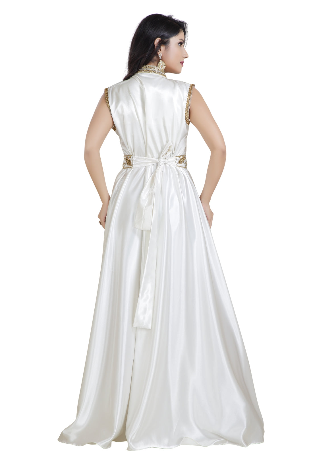 This golden colour beads and sequins hand embroidery with golden lace will glitter up your occasion. This cream colour satin fabric kaftan dress is 2 piece set (with belt) & sleeveless dress (This Dress Is Lined from the Inside). Golden color sequins, beads, and hand stitching for a wedding or bridal occasions is classy and suits well into every wardrobe. The designs on this beautiful piece can brighten your occasion with grace and attraction. |