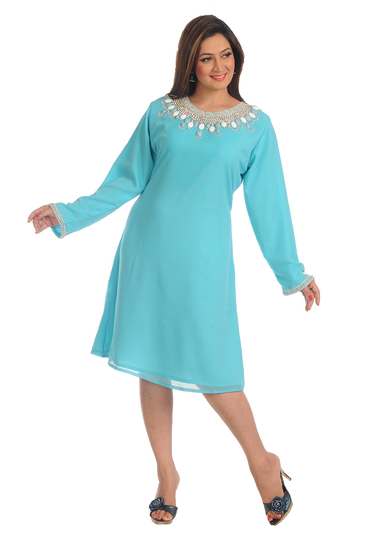 Add some pastel tones to your look with this stunning kurti which is very versatile and easily worn. Sky blue and georgette fabric, this multi-colored sequins and beads hand embellishment, with pearls and stones to garnish your day is your perfect summer outfit. It features u-neck with knee length, kaftan style, full sleeve, and interior lining for a look that will give you confidence. This georgette fabric kaftan dress is 1 piece set & full sleeve dress (This Dress Is Lined from the Inside). Dress length : 42 inch |