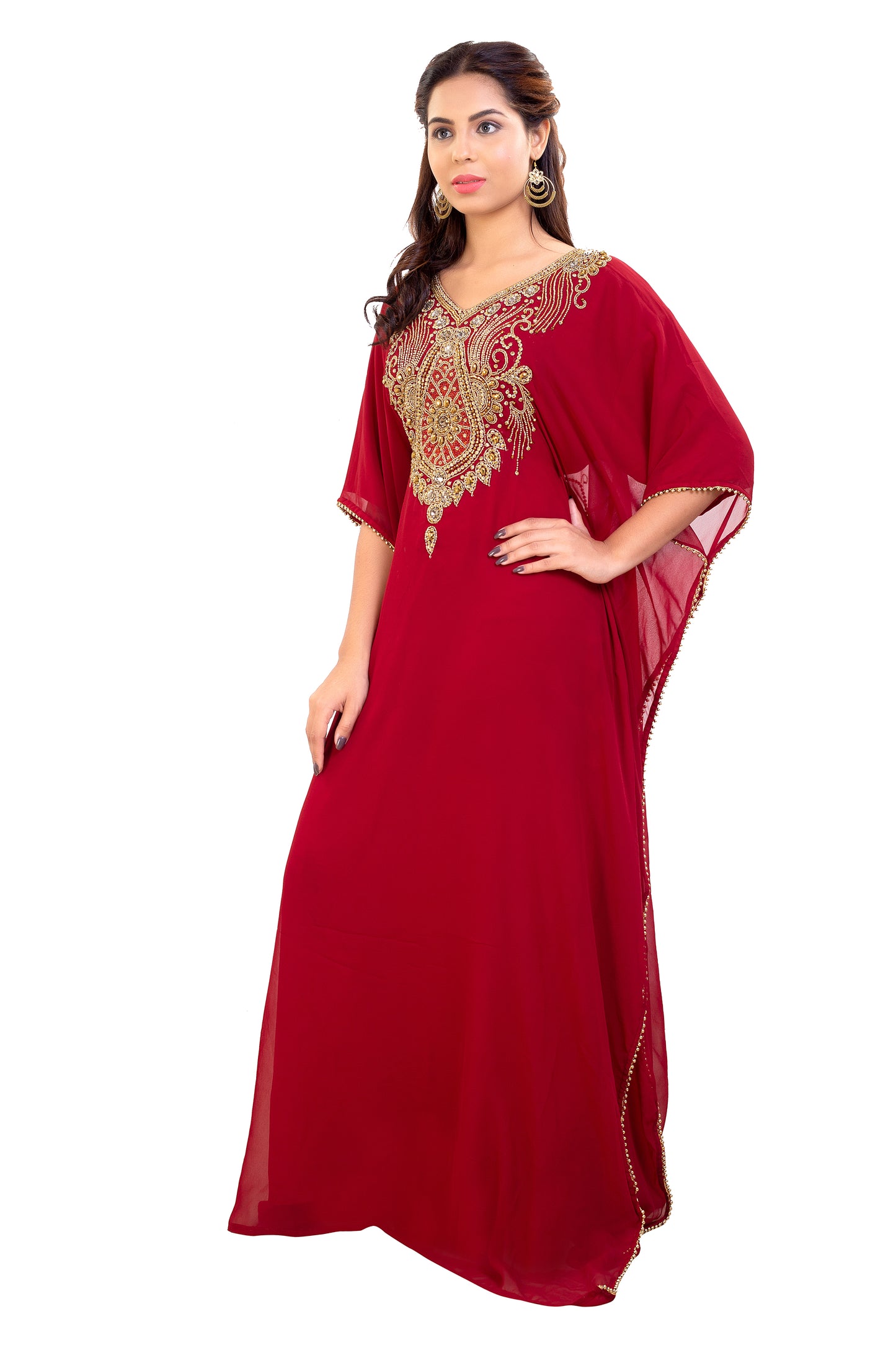 Dazzling and stylish dress, is adorned with golden beads, crystals, and sequins that are stitched with hand, and studded by fine specialist employee to correspond to the prosperity of cultural tradition. This eye-catching kaftan dress is astonishingly hand embroidery with high class fabric and exhibit good-looking drapes with elegance and flares that will increase your charm and improve your attractiveness. This maroon color dress comes in a 1 piece set with half sleeve and interior lining. |