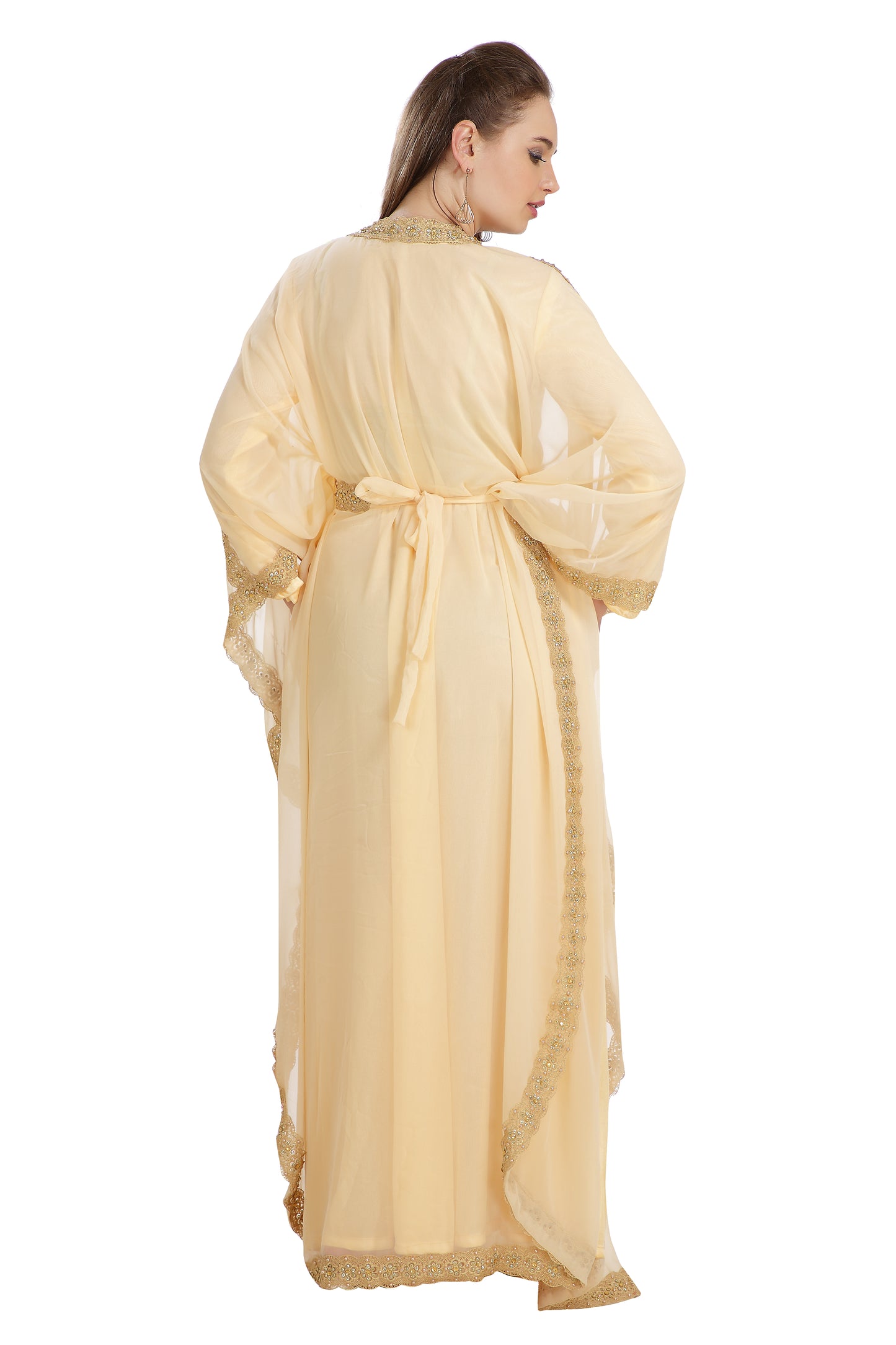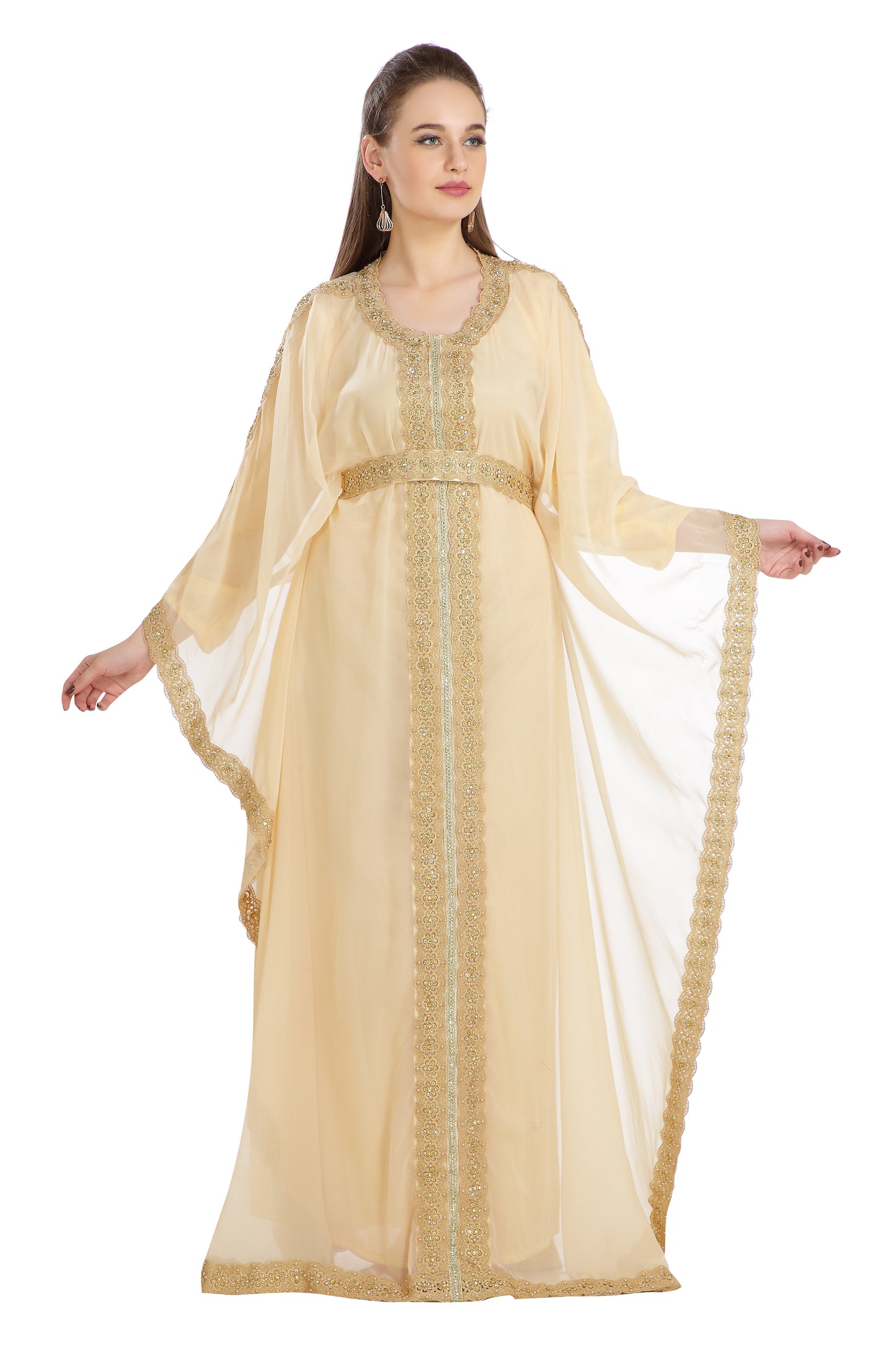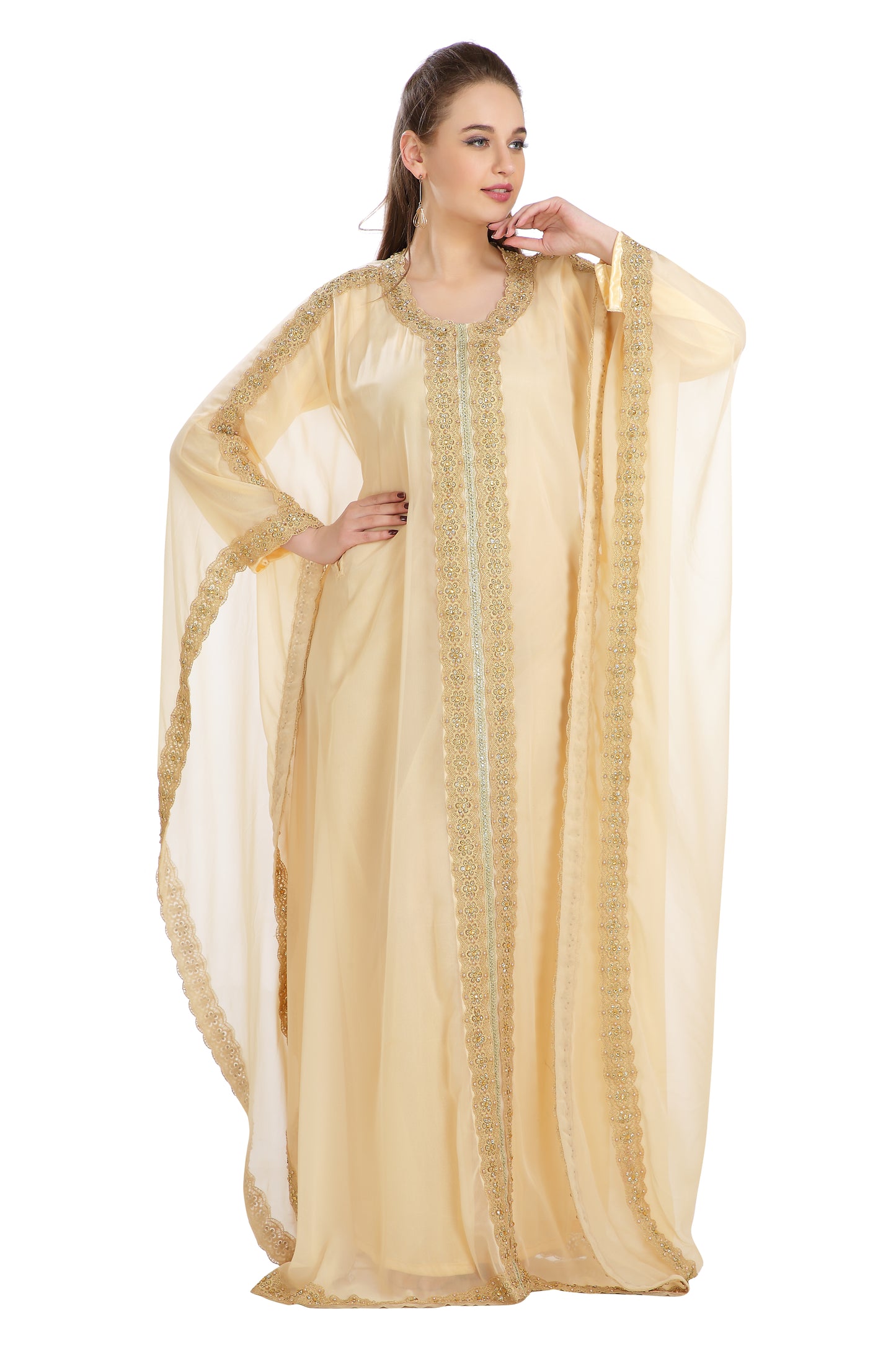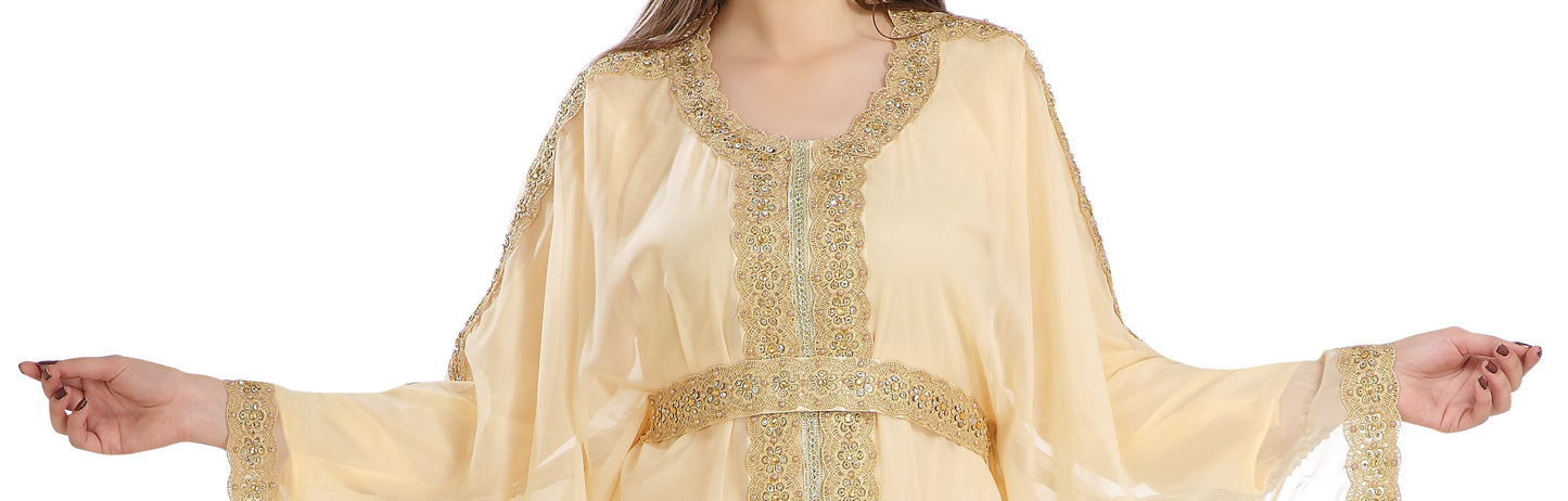 This Attractive Pleasing-To-The-Eye Attire Is The Ultimate Dress For All Occasion, With The Unique Golden Color Sequins And Beads. The Golden Hand Embroidery Outfit Remains The Best In The Stylish Kaftan Production Sector. The Beige Coloration, As Well As Georgette Kaftan Maxim Creation’s Innovation Is Irresistibly New And Ought To Be Ordered As A 2 Piece Set, ¾ Sleeve Kaftan . This Dress Has Inside Lining To Give The User Enough Comfy. You Can’t Afford To Miss This Georgette Kaftan Fabric Dress. |