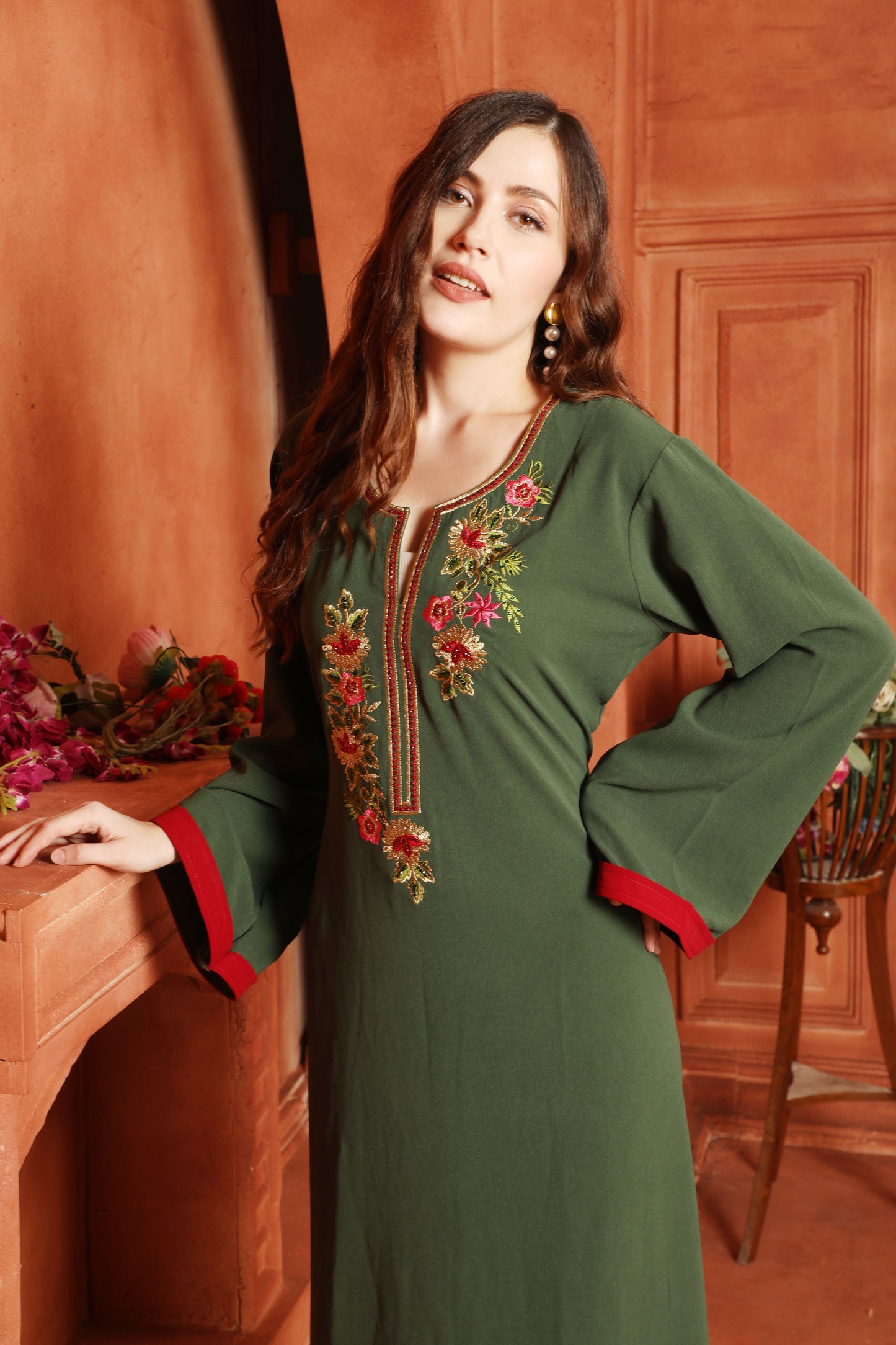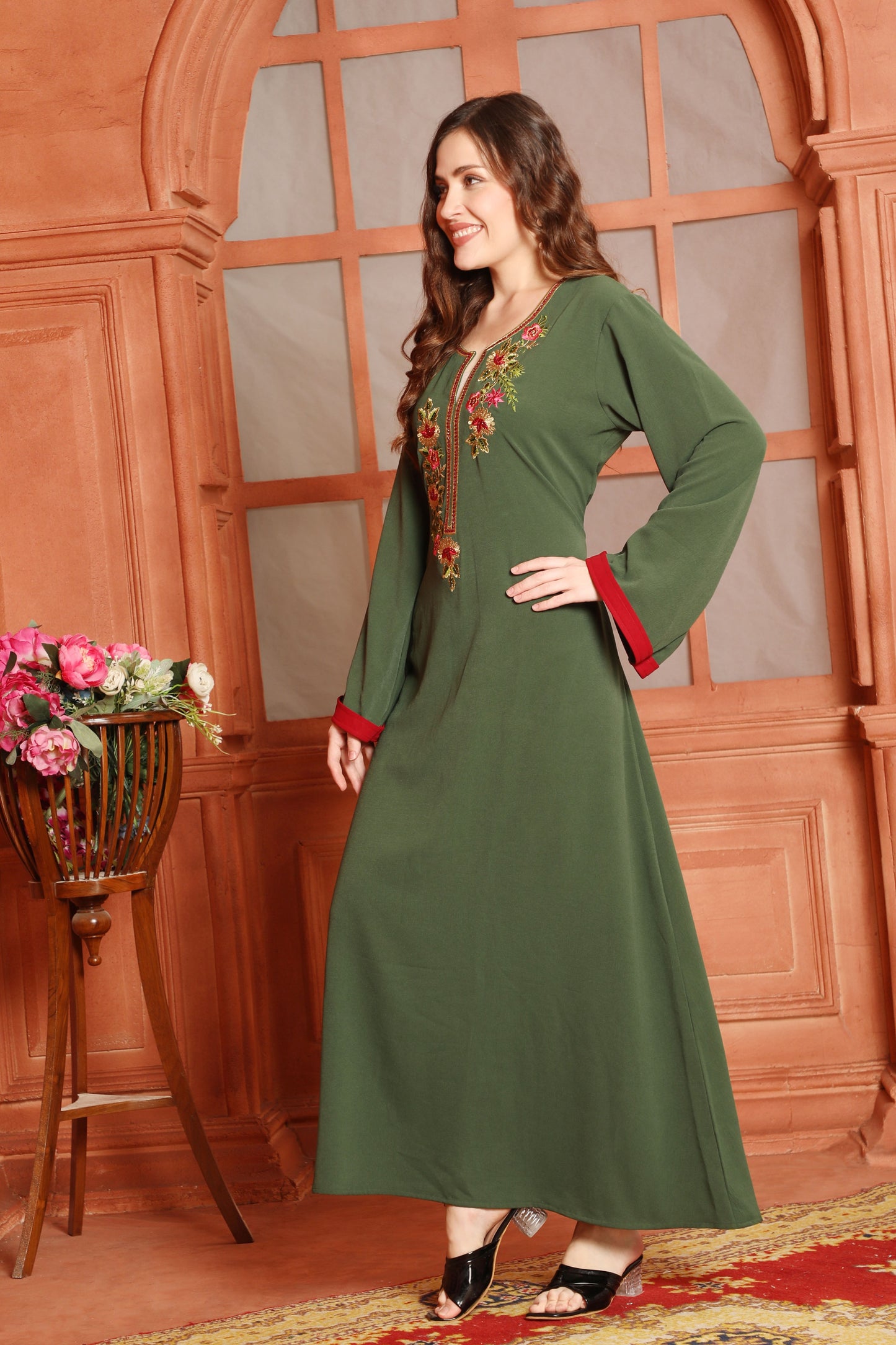 Olive Green Modest Gown with Red Floral Thread Embroidery – Elegant Style Dress |
