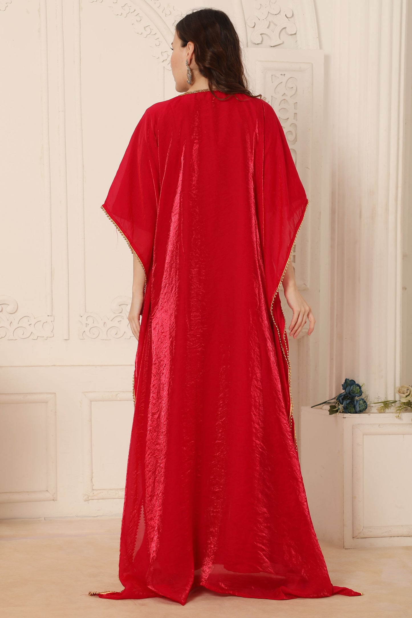 Rani Pink Kaftan Dress with Mirror Embellished Neckline and Crystal Fringe |