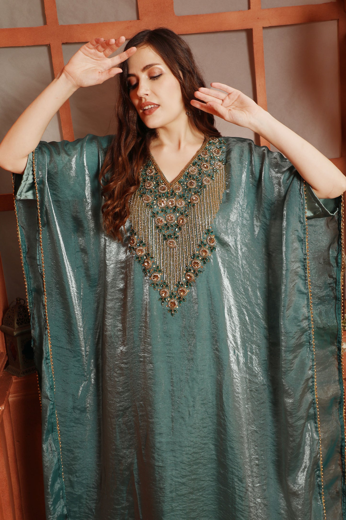 Sea Blue Crushed Kaftan with Hand-Embroidered V Neck and Beaded Tassels