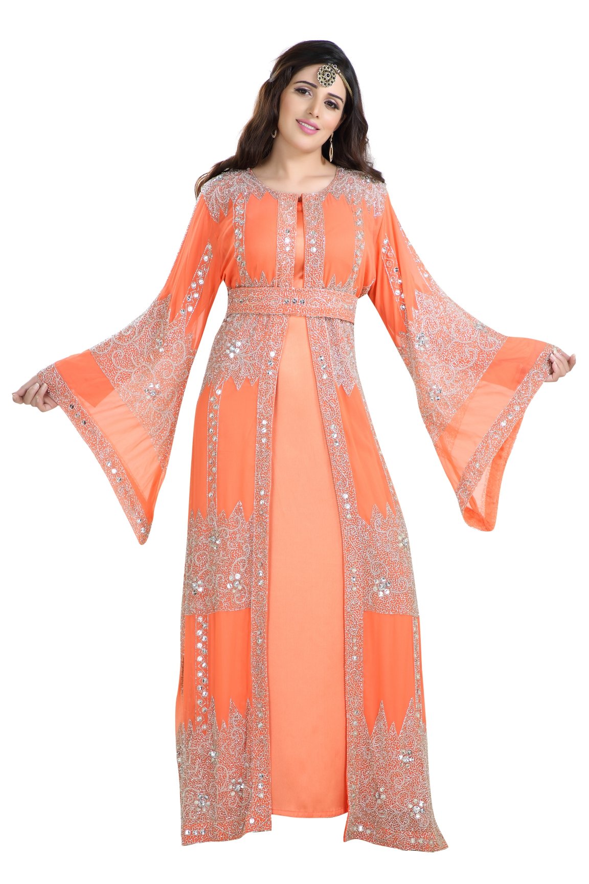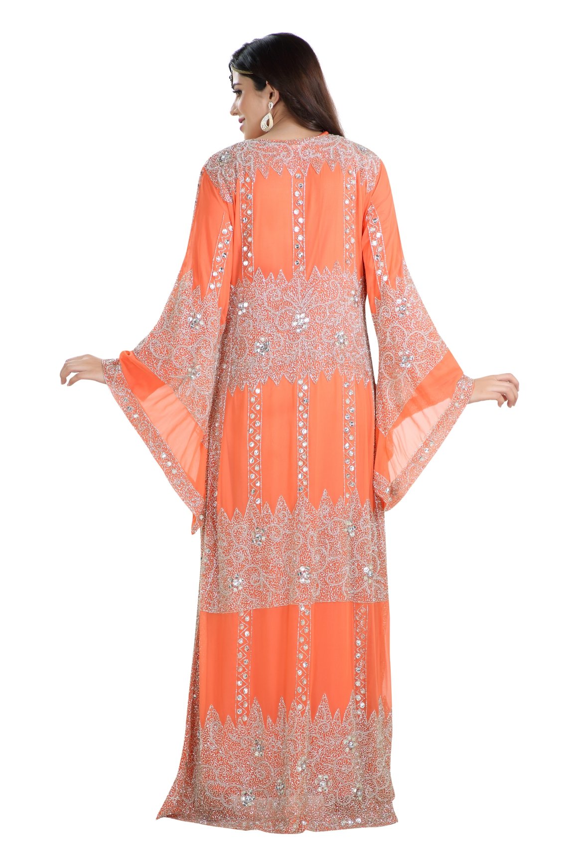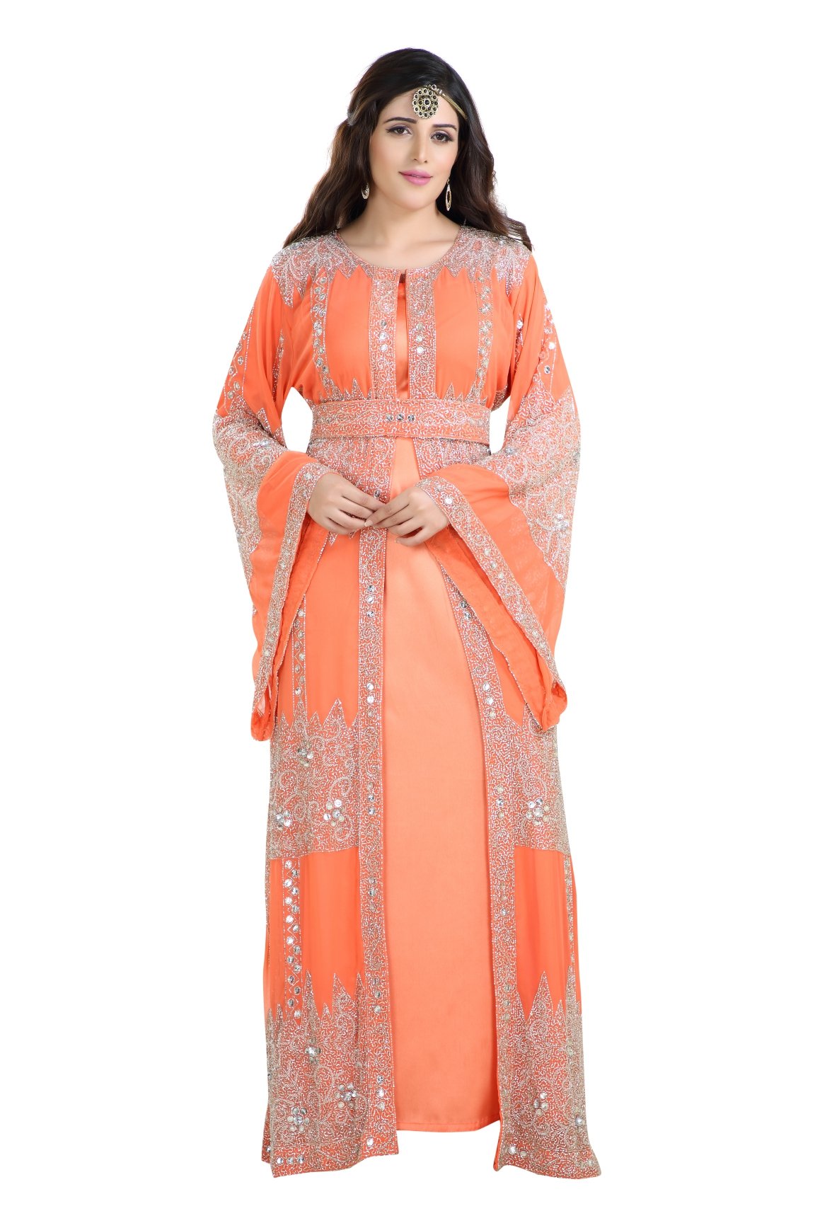 This silver colour beads and sequins hand embroidery will glitter up your occasion. This tomato color georgette fabric kaftan dress is 3 piece set (with belt) & full sleeve dress (this dress is lined from the inside). If you’re worried about your beauty, then maxim creation is here to assist you. We have brought to you a shiny and wonderfully designed maxi dress that can add charm and grace to your good looks and qualities. This floor length wedding kaftan features hand embroidery with silver sequins and beads, full sleeve . |
