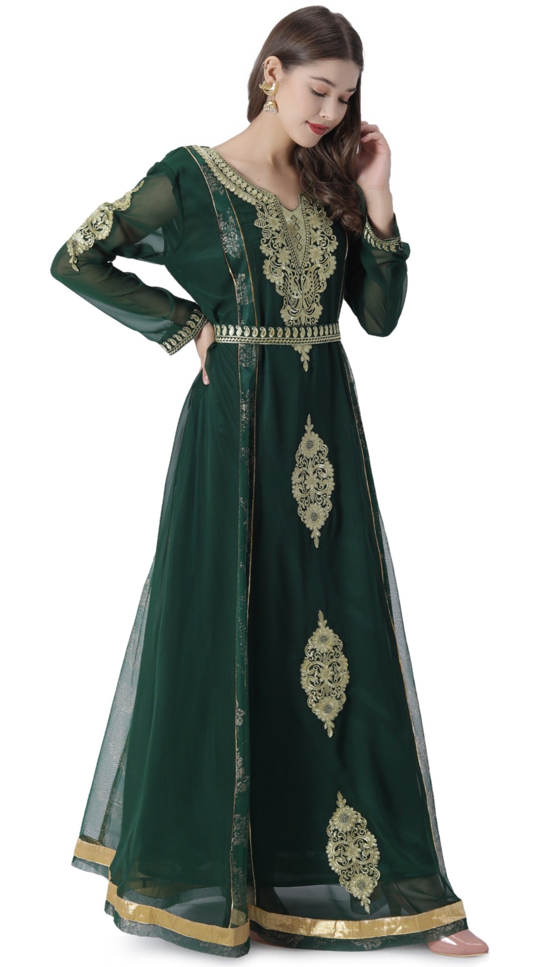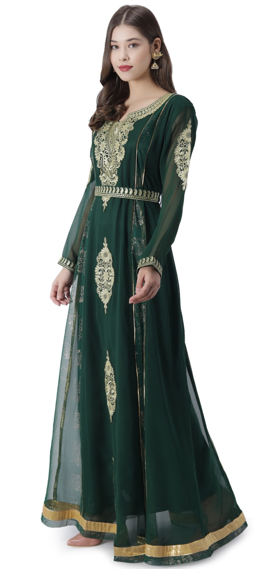 Beautify your look with our new caftan brought you by maxim creation. Crafted by our designers and artisans with Machine Embroidery Work. This bottle green coloured kaftan dress is a 2 piece set which comes with a Embroidered Paisely Belt Design. |