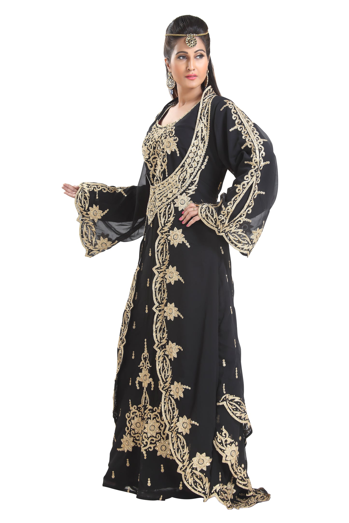 Filch the hearts away using this Purple velvet fabric bridal gown. This timeless and luxurious 2 piece Kaftan dress is perfect for Eid or any function or wedding occasion capturing the heart and attention. The long sleeves and is skillfully embellished with luxurious hand embroidery at the Dress, mix color sequins at the front. The dress is finished with a beaded sash to give an extra touch of elegance. |