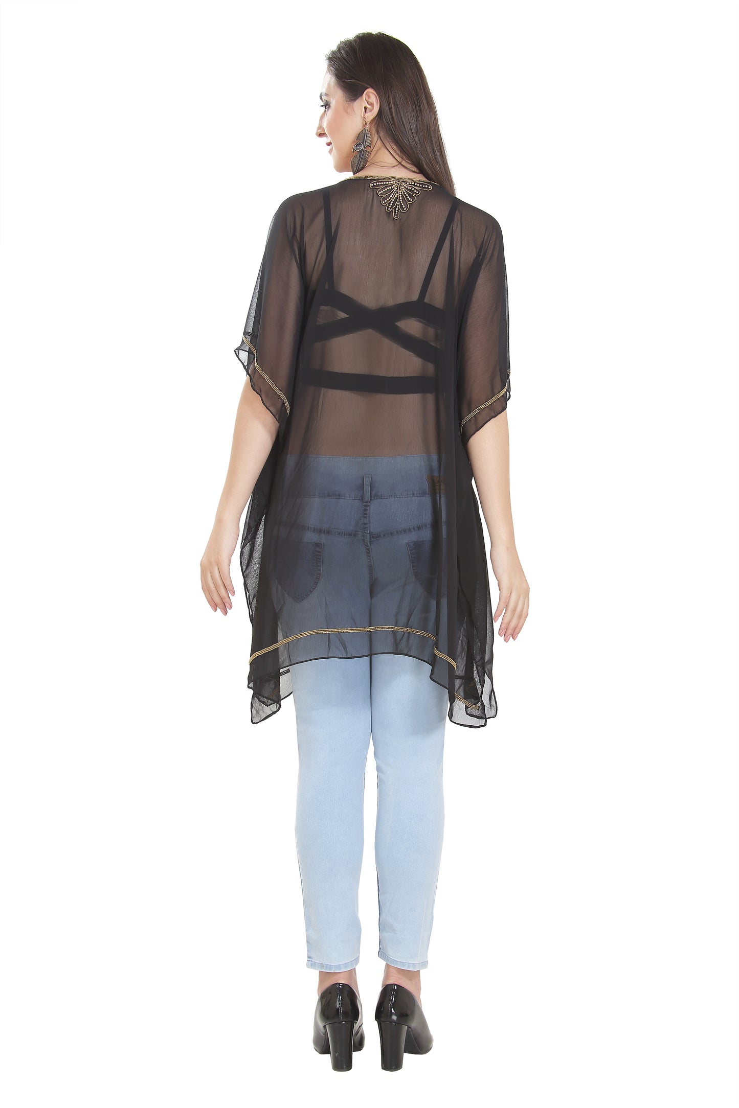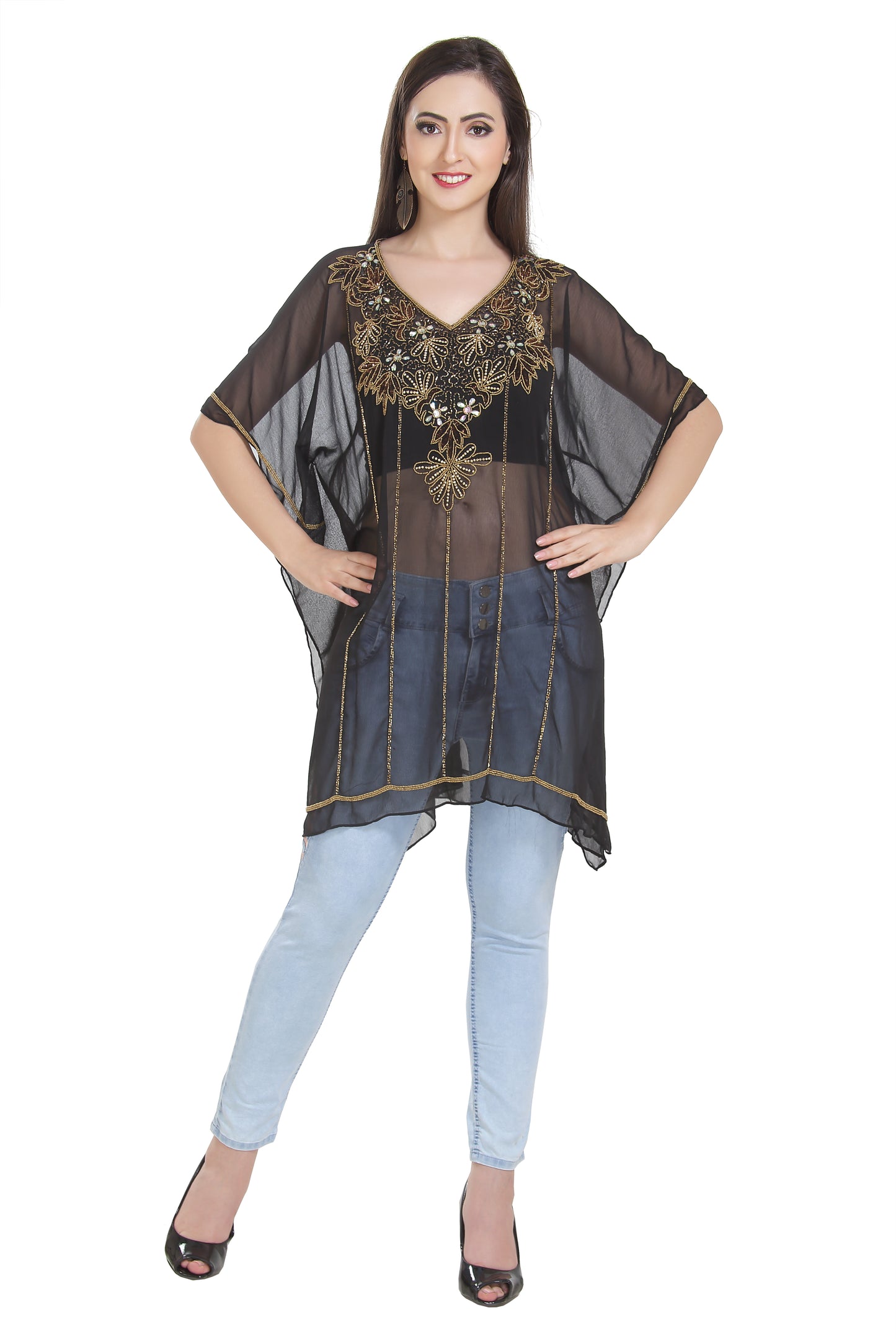 Sexy, elegant and attractive kurti top is available to keep you ahead in this fashion world. The novel cardigan attributes open embroidery for a breathable, yet comfy fit. This georgette material outfit is in a 1 piece set and waist length makes more efficient your silhouette, gratifying all curves. Pair it up with soothe stretch leggings to finalize the trending looks. The short tunic is stimulating all cotton-embroidered blouses featuring V-neck, short & free sleeves as well as edge. This georgette fabric kurti dress is 1 piece set (top only) & half sleeve dress (This dress does not have lining from the inside). Length : 35 Inch |