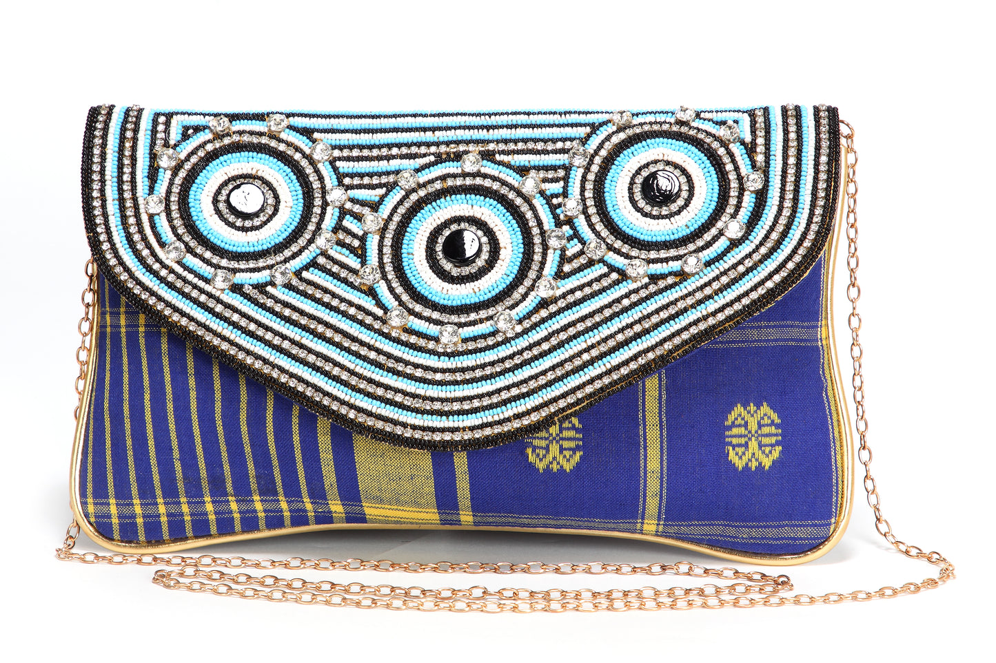 Here is a super elegant Ladies Party Clutch to pair it with your designer party dress. This comes in Kantha Fabric which has Colorful Crystal Beaded Work all around it & which is found trendy right now ensuring that it completes your outfit look. Wipe it with soft cloth, keep away from water and direct sun light. After using it, please store it into dust free bag, do not expose to extreme heat This Hand Made Clutch comes with Golden Chain Shoulder Strap |