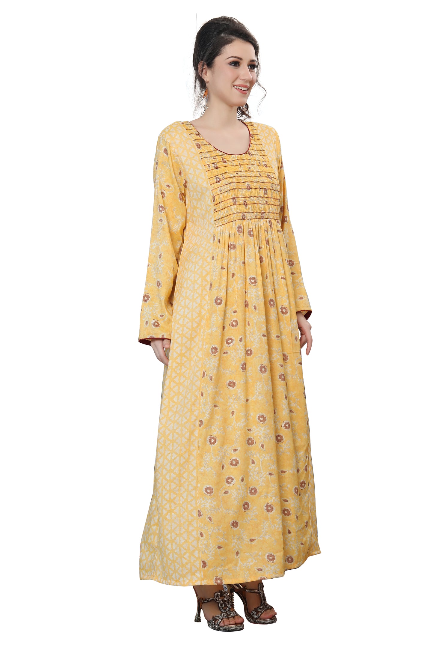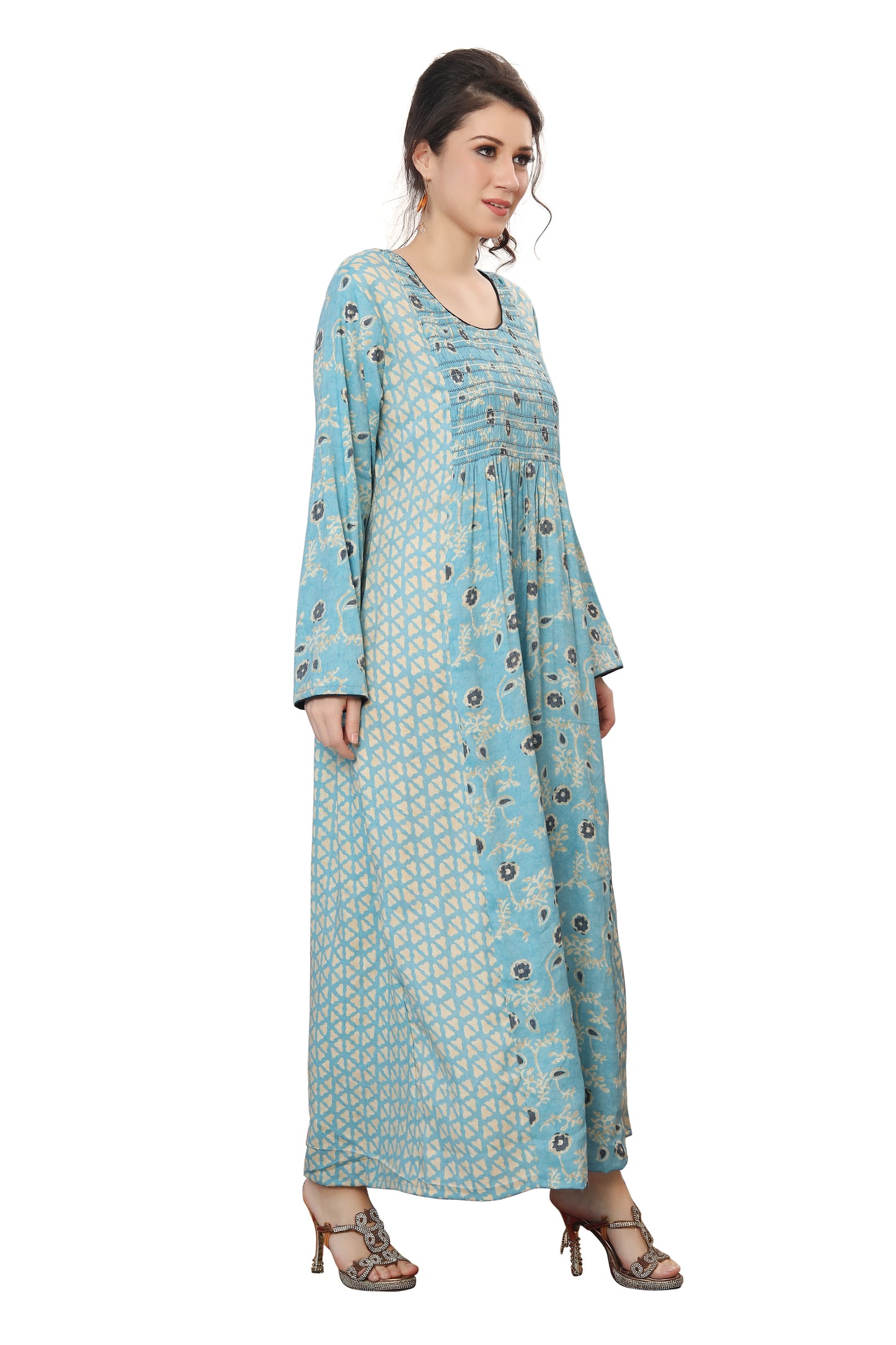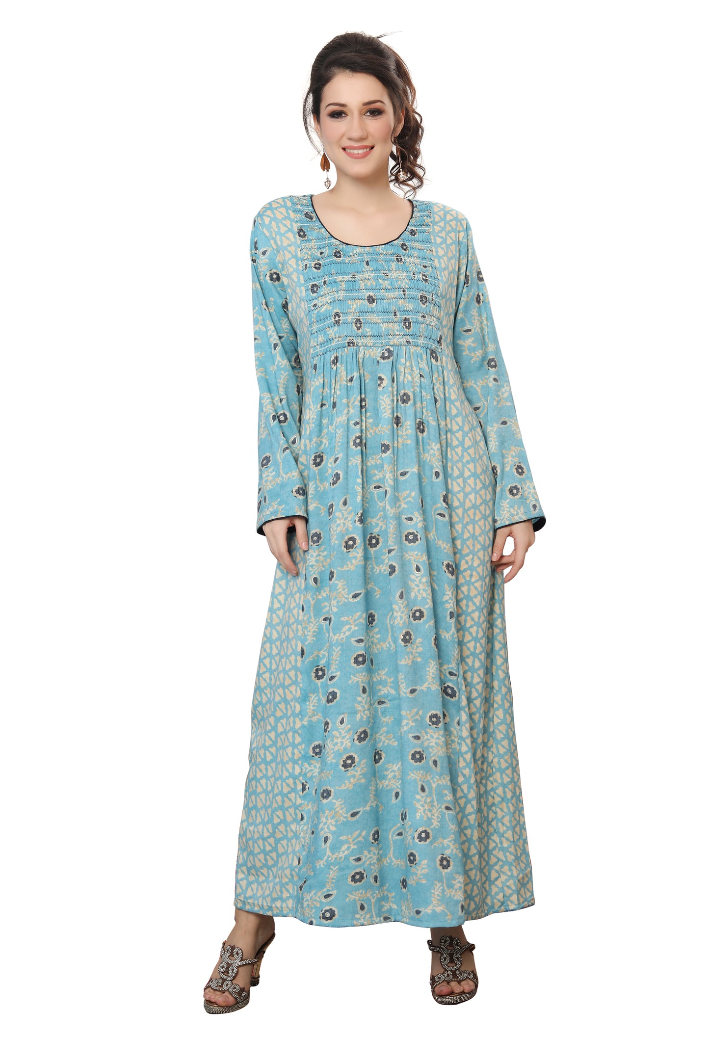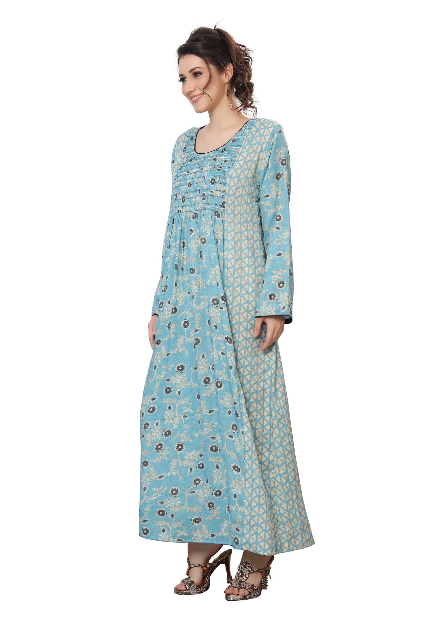 Most hand Embroidery dresses have Crystals, Beads and Sequins that are put by hand. Owing to the nature of embroidery done by hand a bead or two may fall and this is considered normal. This is due to the fact its handmade through the artisan's handicraft making process. While shipping, a bead or two may come off and we provide special material packages with all our dresses to address the same.