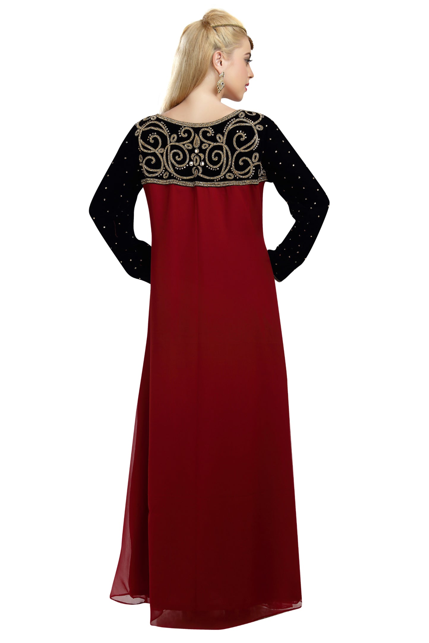 Embroidered Kaftan in Black-Maroon Velvet Fabric Takchita Gown - Maxim Creation
