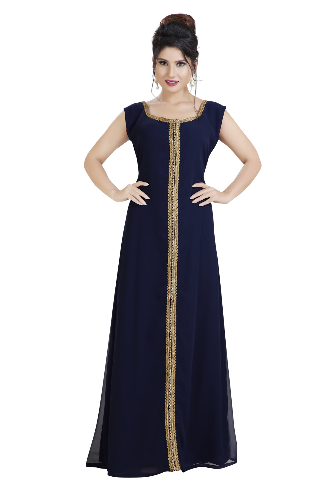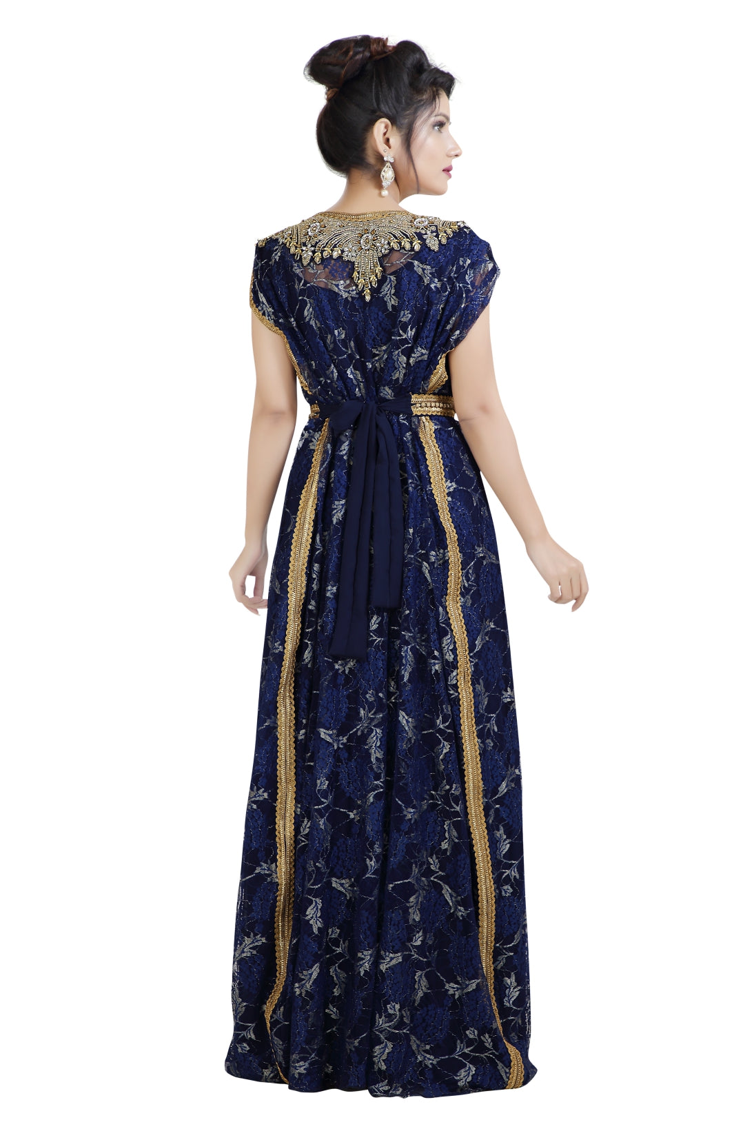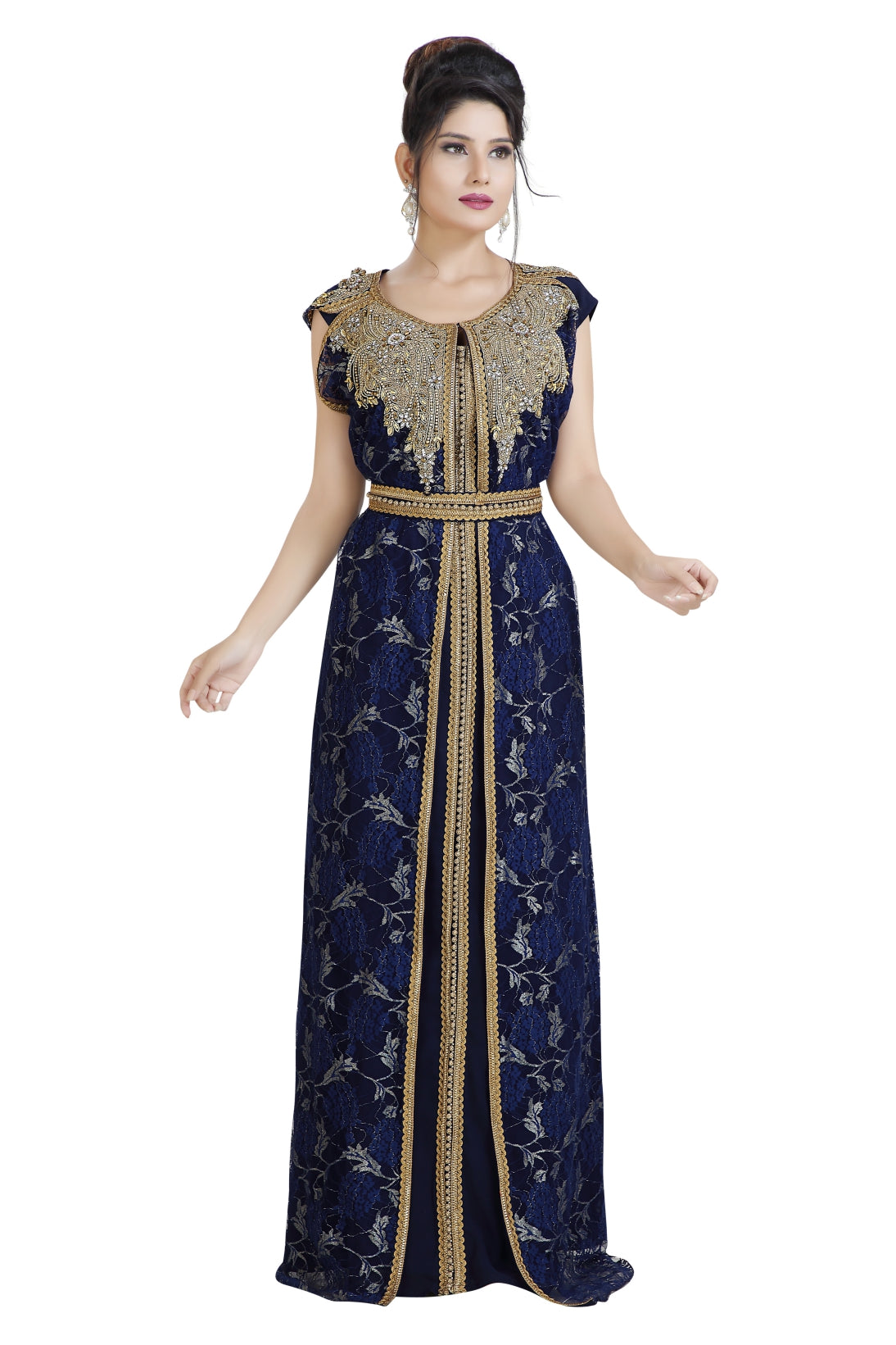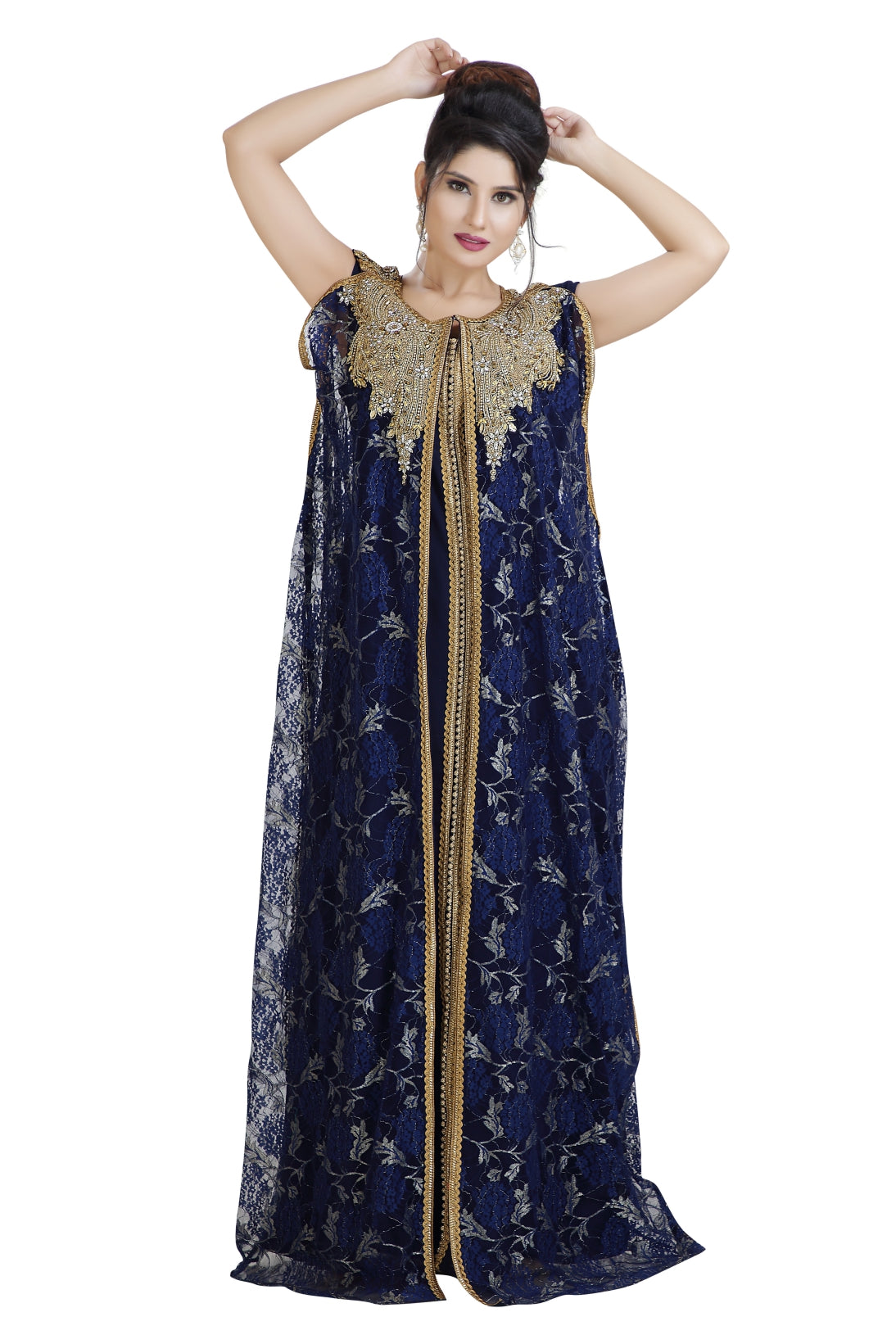This mix colour beads and sequins hand embroidery with lace will glitter up your occasion.this navy blue net fabric kaftan dress is 3 piece set & sleeveless dress (This Dress Is Lined from the Inside). A contemporary and a designer cape in navy blue mix hand embroidery work to rock your summer party! This sleeveless dress has hand touch sequins and beads lined up from inside with a perfect net material to make you feel comfortable. |