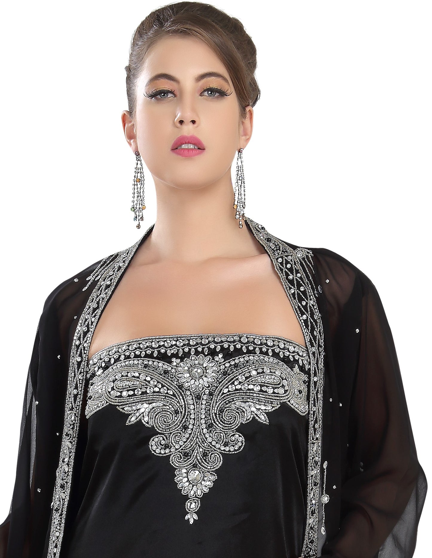 Brought to you by maxim creations, this stunning black dress is designed with hand embroidery and silver color sequins as well as beads. It features an embroidered wrap that serves as shoulder cover since it is a bit transparent ! Even without a belt, this 2 piece would fit you very well and remain versatile, reflecting excellent designs. Compliment this outfit with a pair of glossy bellies and a matching clutch to enhance your charm! |