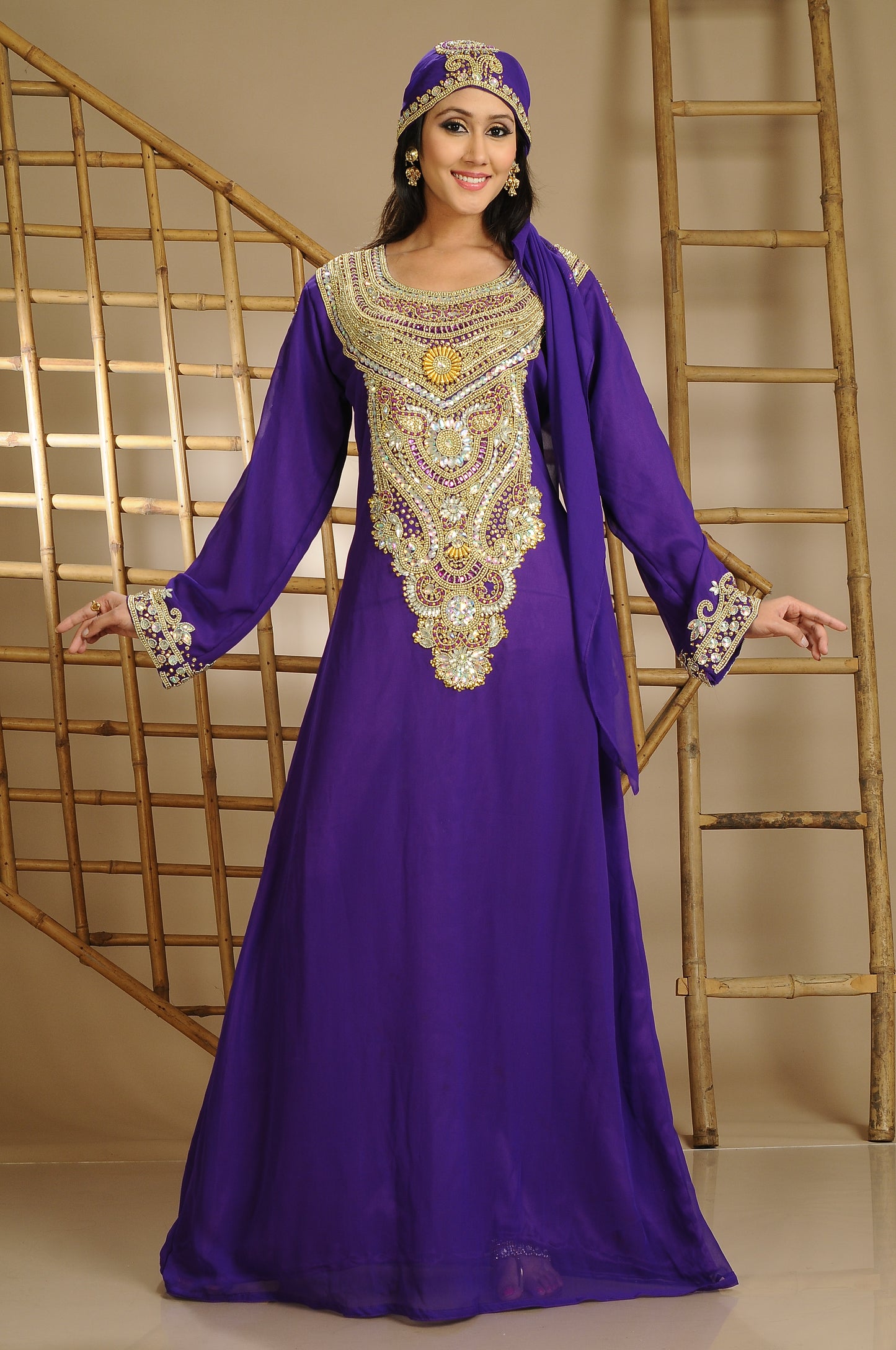 This Purple Colour Georgette Fabric Kaftan Dress Is 1 Piece Set & 3/4 Sleeve Dress (This Dress Is Lined From The Inside). With U-Neck And A-Line Silhouette And Designer Umbrella 3/4 Sleeves, This Farasha Soiree Evening Gown Is Suitable For Summer Wedding Or As A Casual Wear. It Can Help You Look Drop Dead Pretty Because Of The Hand Embroidery Works Of The Colorful Beads And Sequins. |