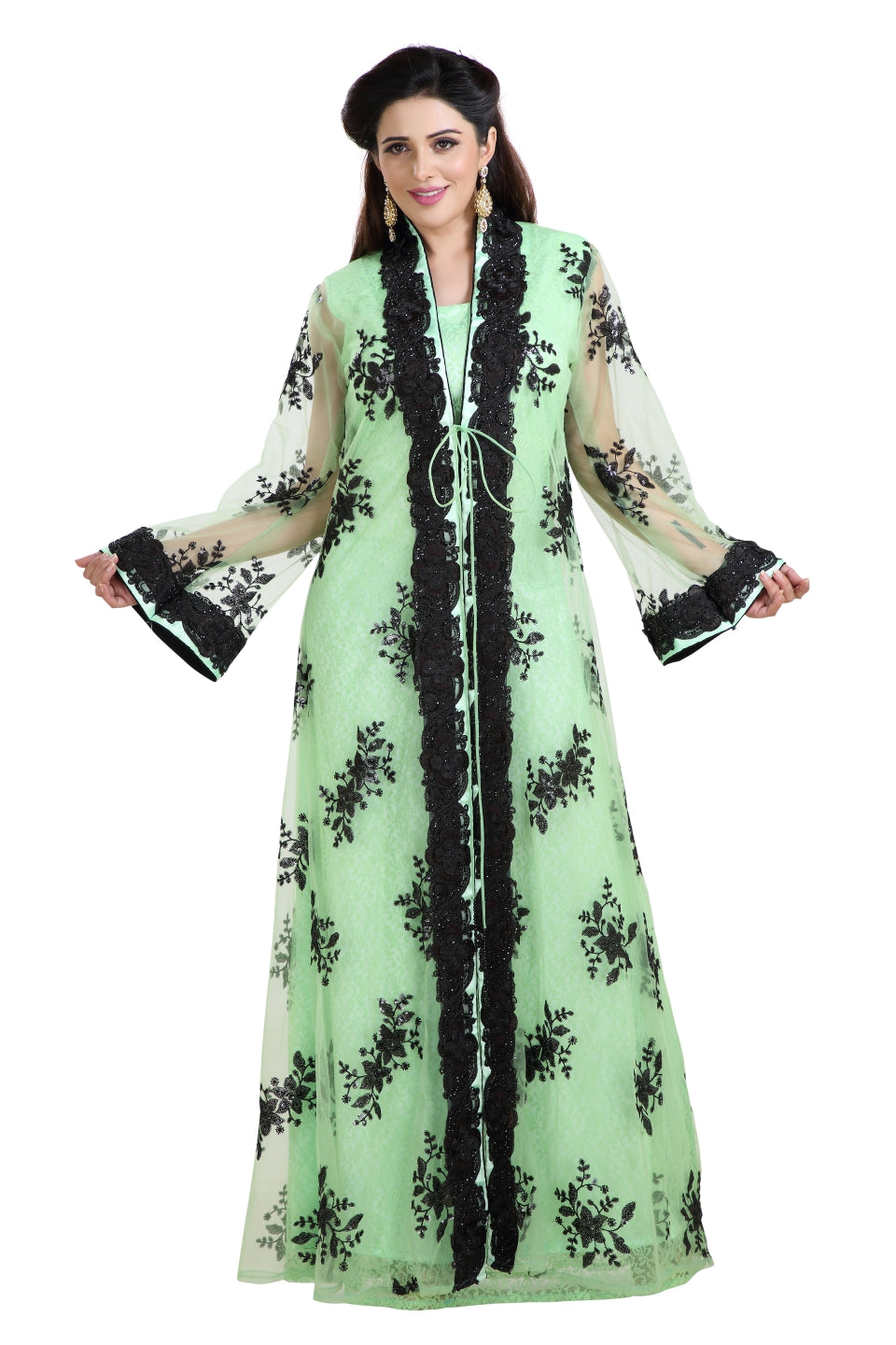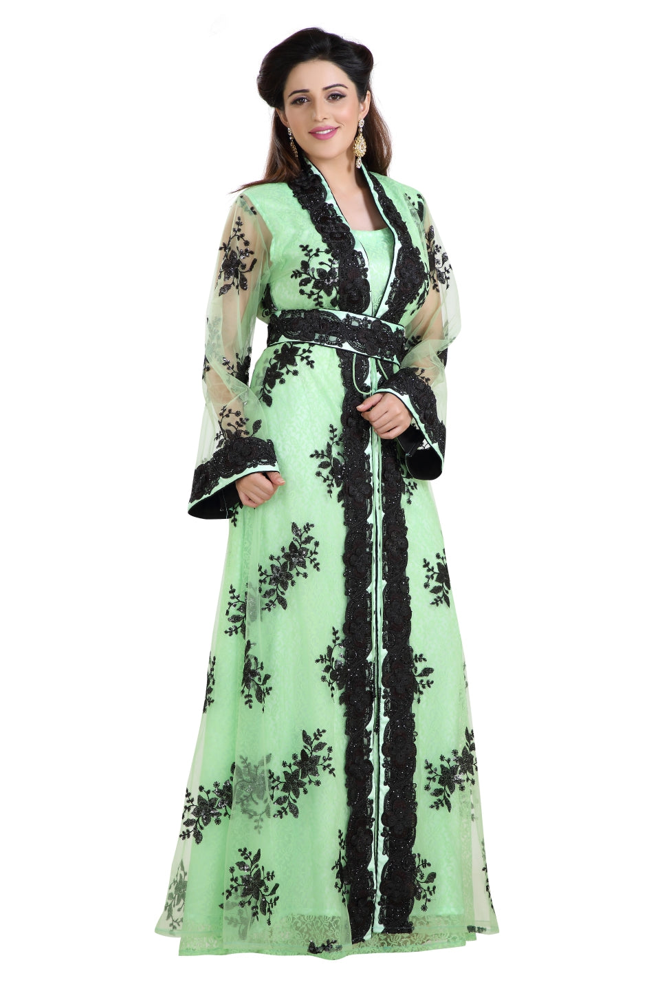 This Timeless And Luxurious 3 Piece Kaftan Dress Is Perfect For Eid Or Any Function Or Wedding Occasion Capturing The Heart And Attention. The Jacket Has Long Sleeves And Is Skilfully Embellished With Luxurious Hand Embroidery, Black Color Sequins With A Slit At The Front. The Dress Is Finished With A Beaded Sash To Give An Extra Touch Of Elegance. |