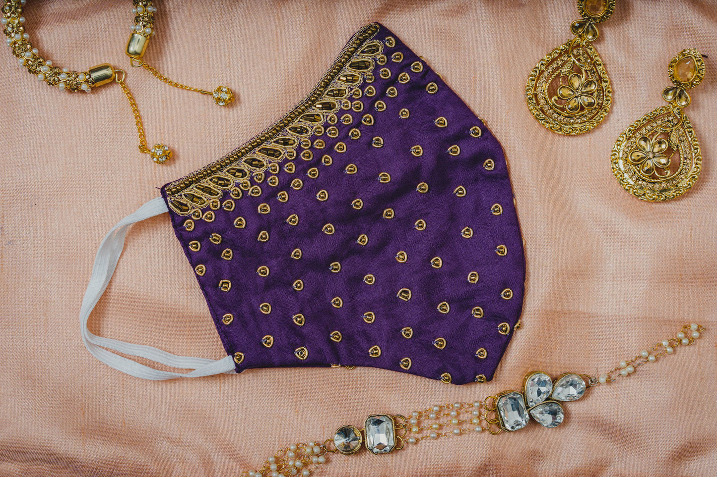 This is a Purple coloured Polka Dot Face Mask with Golden Hand Embroidery Beads. The designers and artisans have made each and every piece by their own hands. Maxim Creation keeps safety as a first priority with unique and fashionably hand crafted designs. This timeless and luxurious piece face mask is perfect for family functions and parties or wedding occasion and casual wear. |