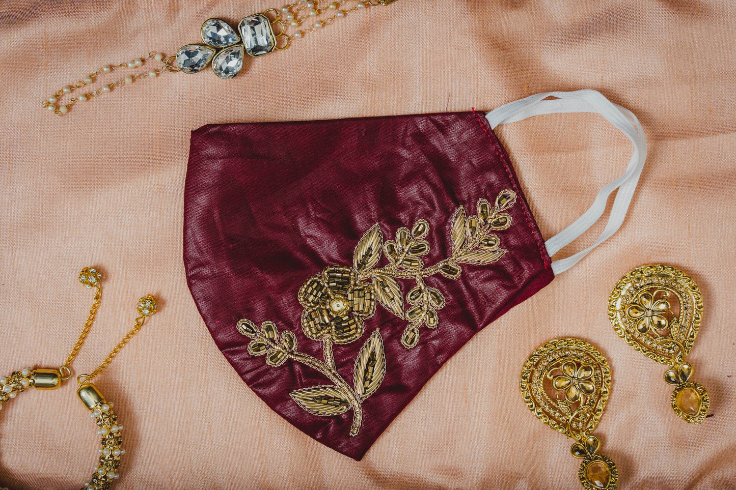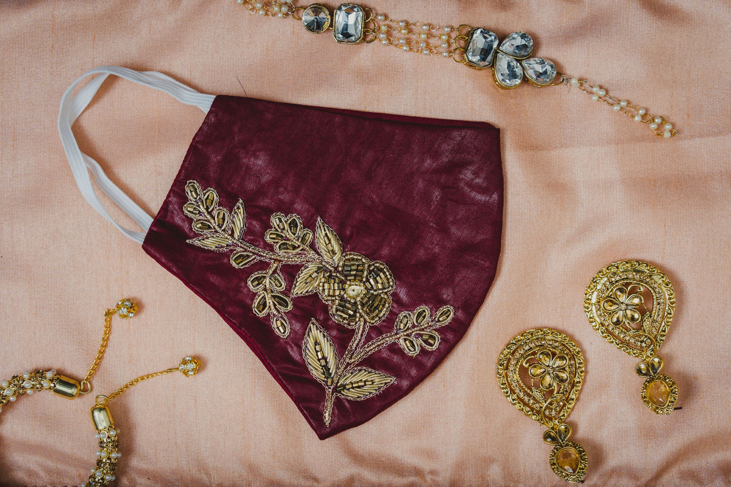 Red coloured cotton face mask with intricate hand work. Designs in the form of leaf embroidery are done. Maxim Creation offers you this mask which can be used for your significant / special occasion. Cotton with gloss finish. Maxim Creation keeps safety as a first priority with unique and fashionably hand crafted designs. This timeless and luxurious piece face mask is perfect for family functions and parties or wedding occasion and casual wear. |