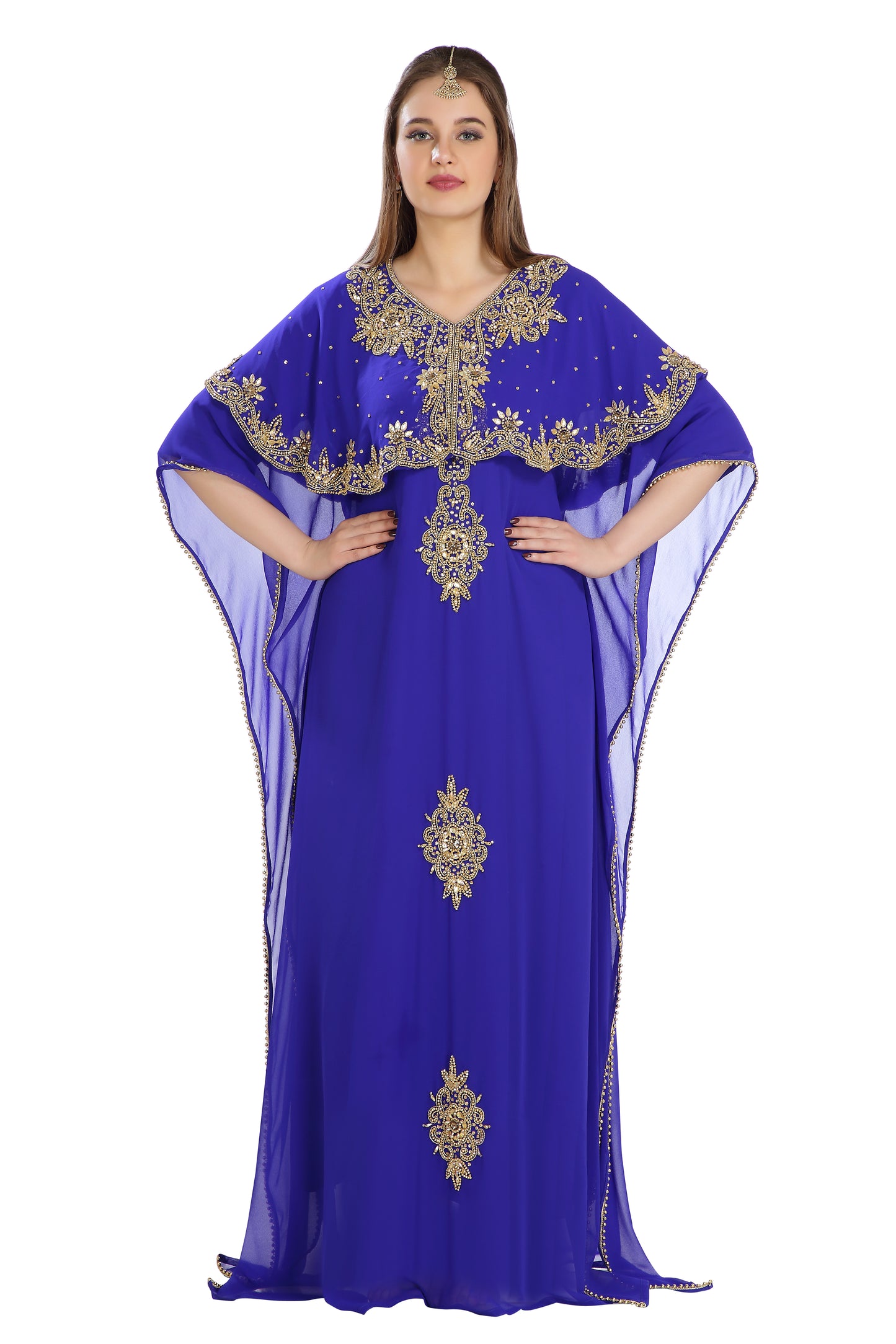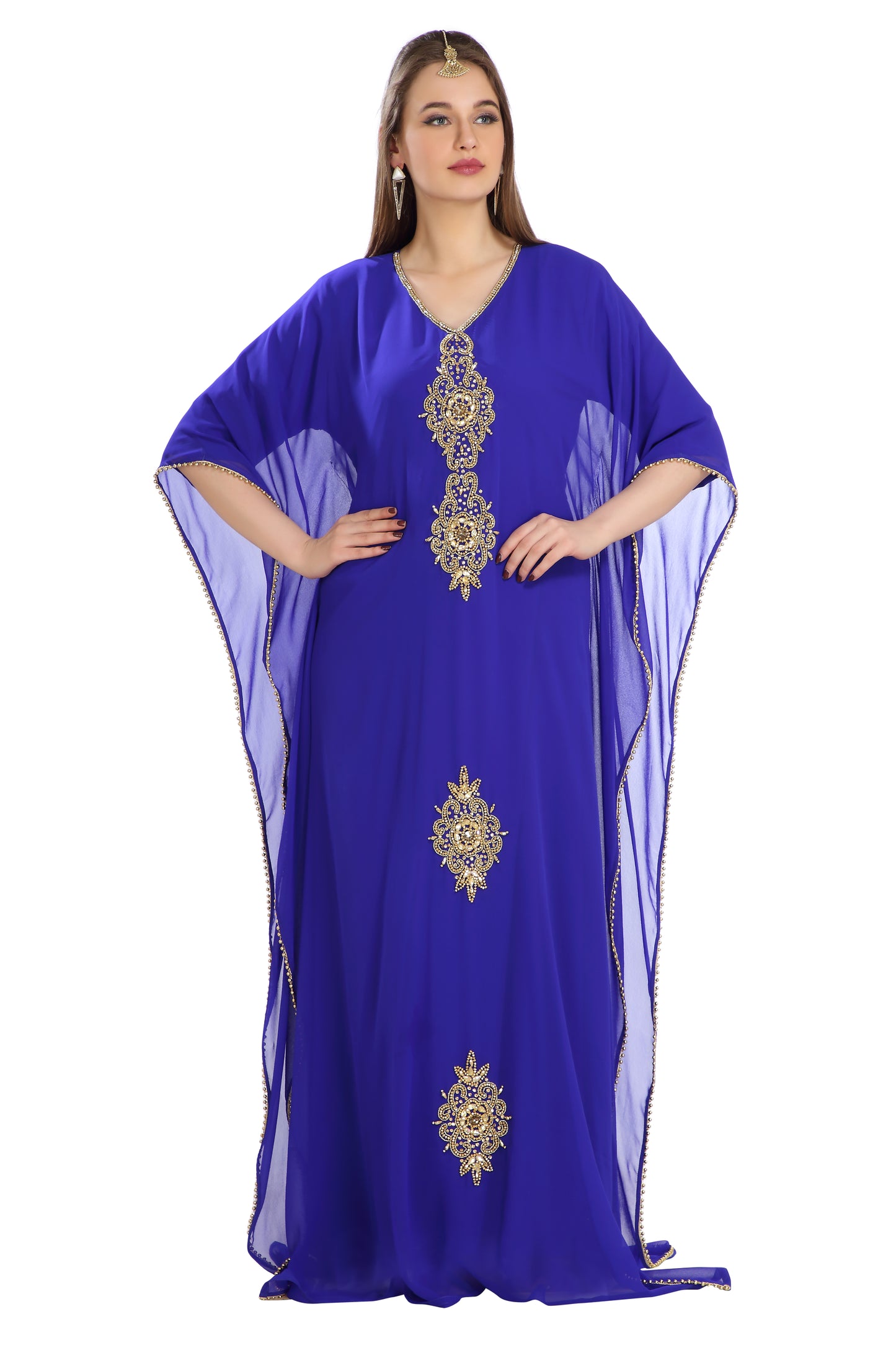 Feel like a superstar in this long royal blue islamic party wear gown. This georgette dress has an overcoat with kaftan sleeves that is very trendy right now ensuring that your figure looks its very best. Streamlined and elegant, this dress is for the modern era woman. Carry this dress with high heels and a pair of sleek earrings to enhance your beauty. This dress is 2 piece set & half sleeve dress (This dress is lined from the inside) |